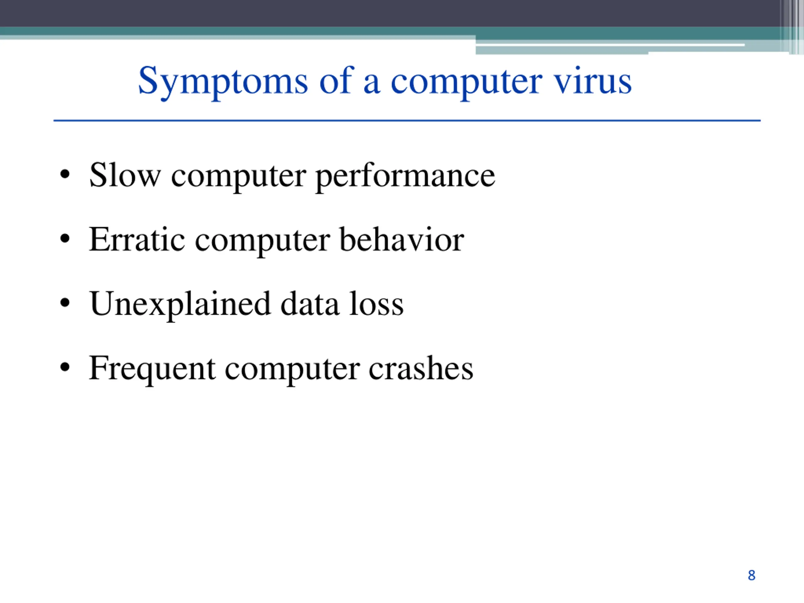 Symptoms of a computer virus Slow computer performance Erratic computer behavior Unexplained data loss Frequent computer crashes 8