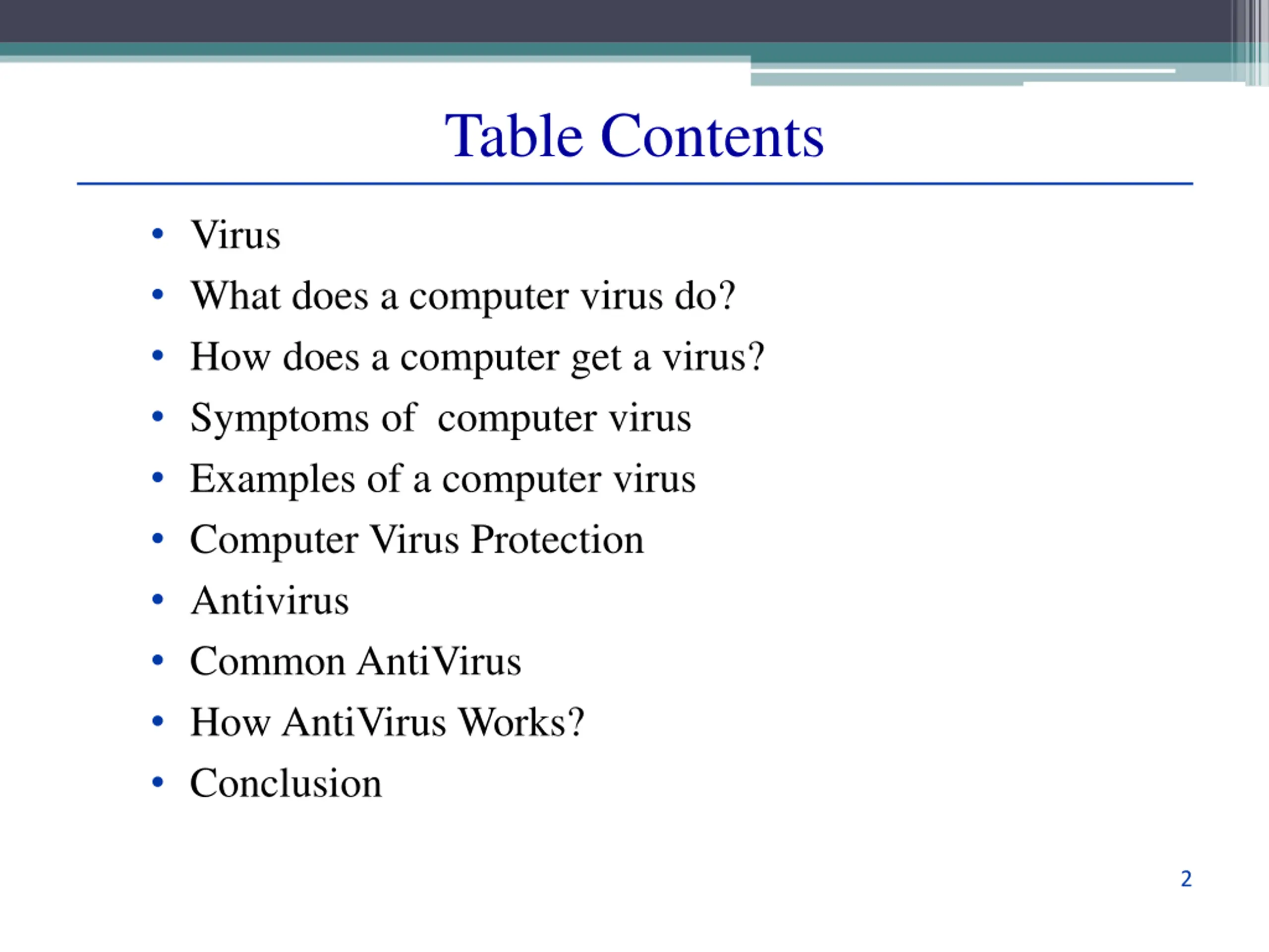 Table Contents Virus What does a computer virus do? How does a computer get a virus? Symptoms of computer virus Examples of a computer virus Computer Virus Protection Antivirus Common AntiVirus How AntiVirus Works? Conclusion 2