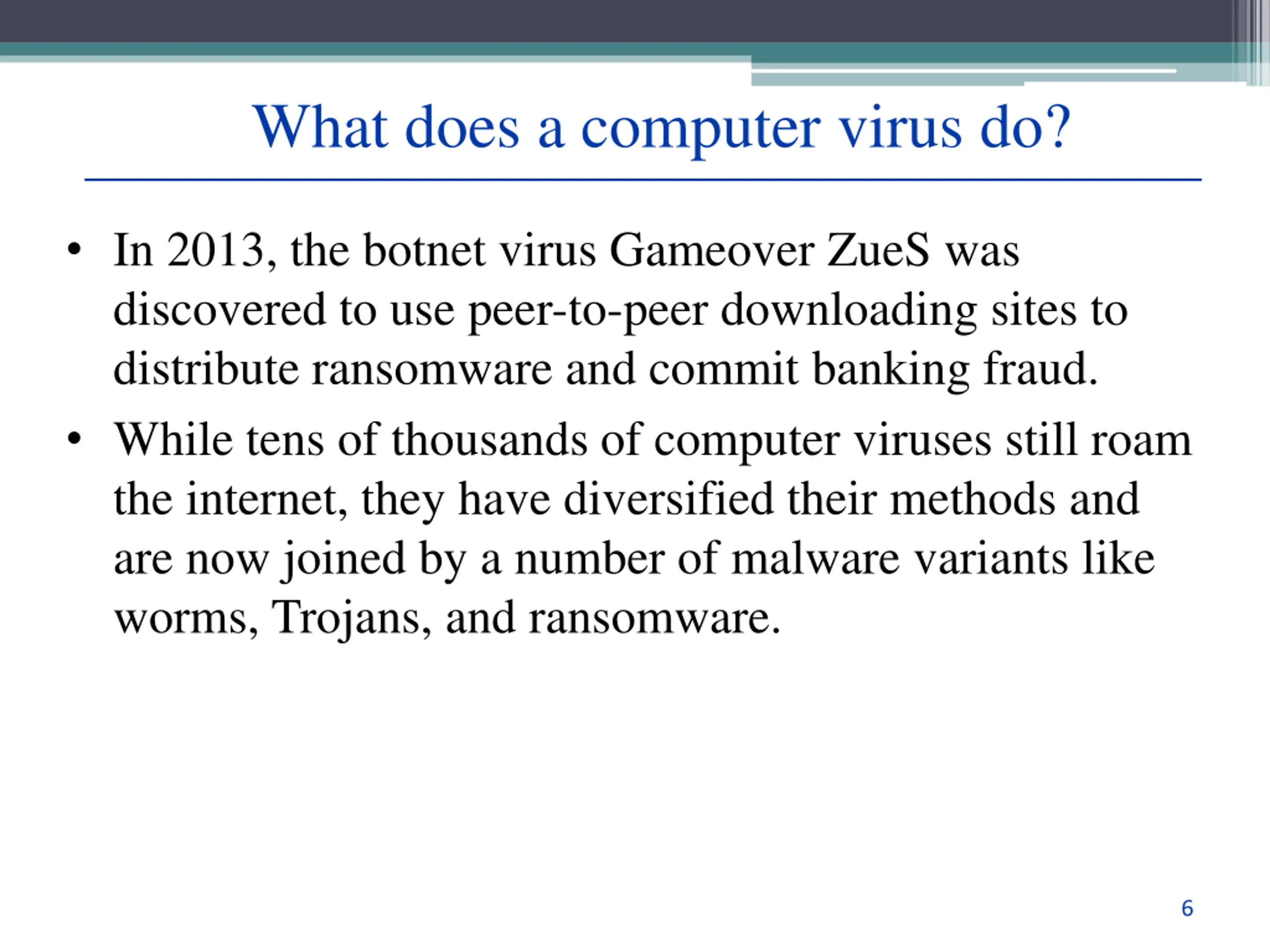 What does a computer virus do? In 2013, the botnet virus Gameover ZueS was discovered to use peer-to-peer downloading sites to distribute ransomware and commit banking fraud. While tens of thousands of computer viruses still roam the internet, they have diversified their methods and are now joined by a number of malware variants like worms, Trojans, and ransomware. 6