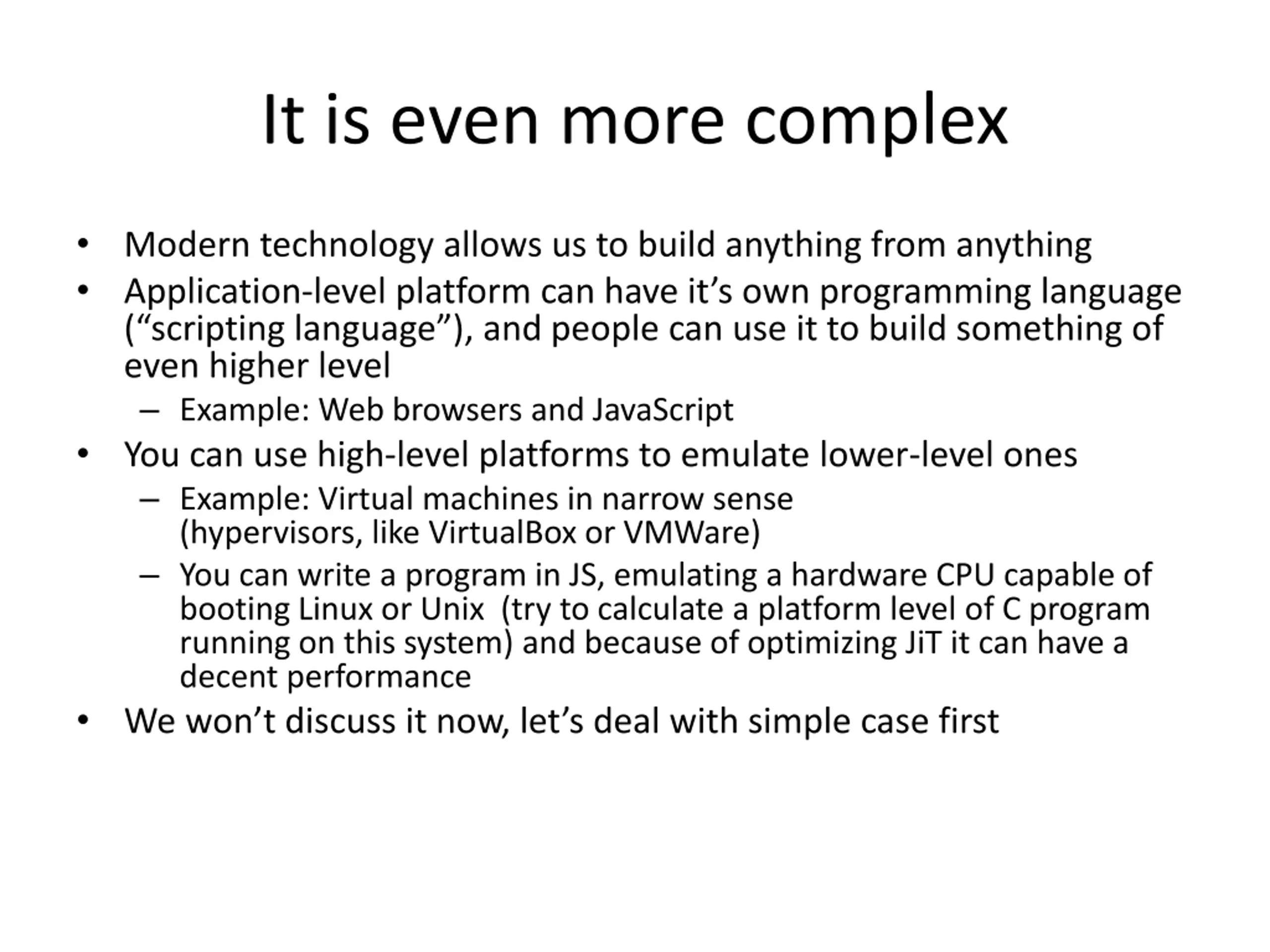 It is even more complex Modern technology allows us to build anything from anything Application-level platform can have it s own programming language ( scripting language ), and people can use it to build something of even higher level Example: Web browsers and JavaScript You can use high-level platforms to emulate lower-level ones Example: Virtual machines in narrow sense (hypervisors, like VirtualBox or VMWare) You can write a program in JS, emulating a hardware CPU capable of booting Linux or Unix (try to calculate a platform level of C program running on this system) and because of optimizing JiT it can have a decent performance We won t discuss it now, let s deal with simple case first