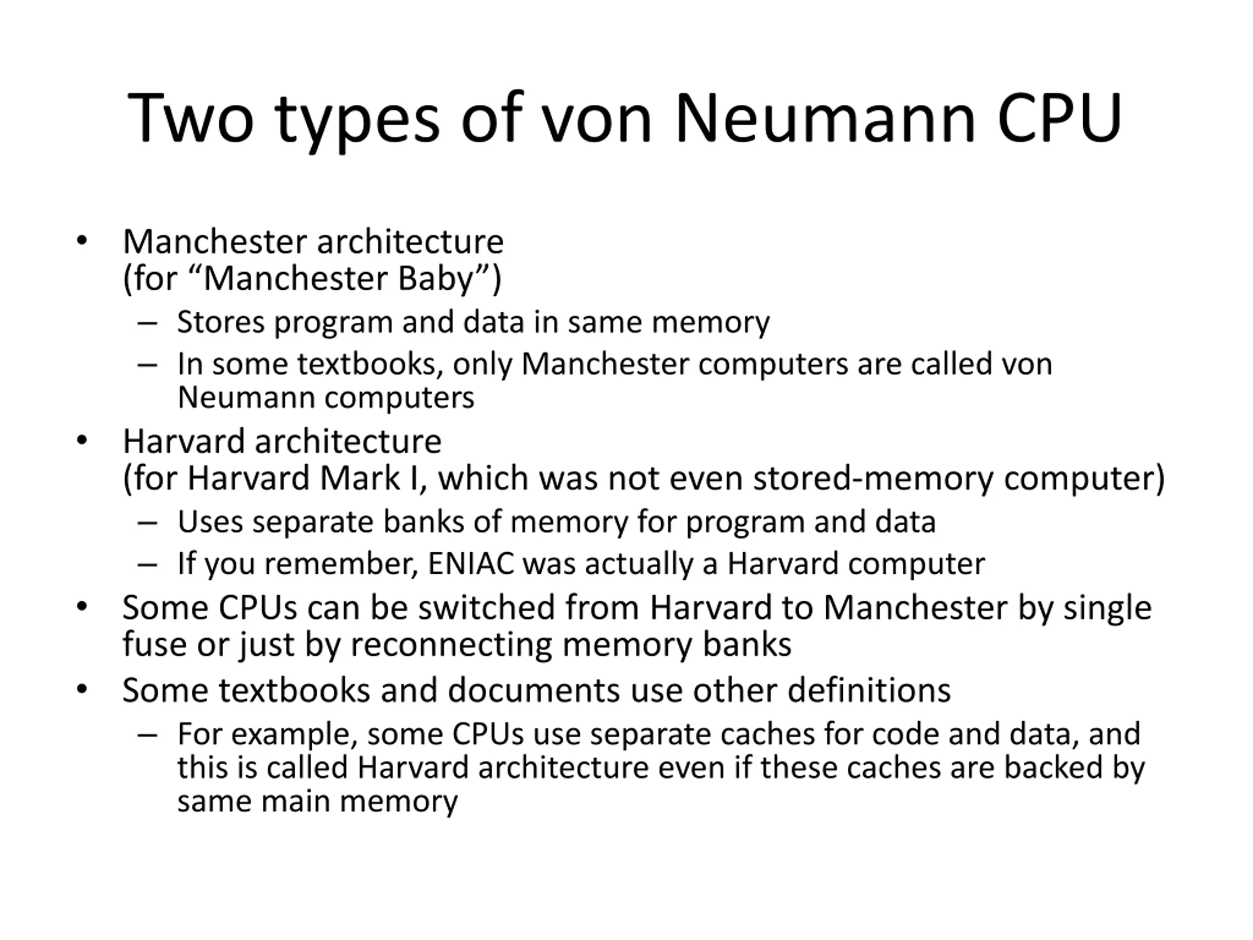 Two types of von Neumann CPU Manchester architecture (for Manchester Baby ) Stores program and data in same memory In some textbooks, only Manchester computers are called von Neumann computers Harvard architecture (for Harvard Mark I, which was not even stored-memory computer) Uses separate banks of memory for program and data If you remember, ENIAC was actually a Harvard computer Some CPUs can be switched from Harvard to Manchester by single fuse or just by reconnecting memory banks Some textbooks and documents use other definitions For example, some CPUs use separate caches for code and data, and this is called Harvard architecture even if these caches are backed by same main memory