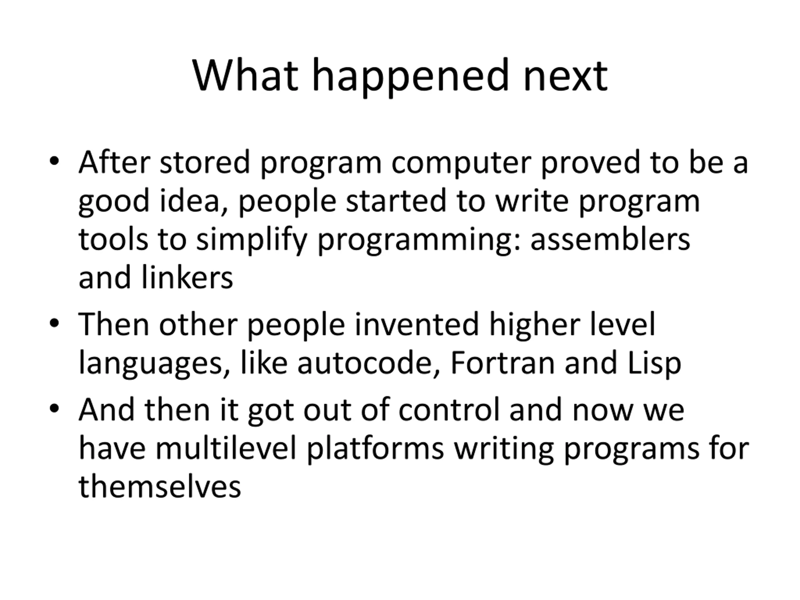 What happened next After stored program computer proved to be a good idea, people started to write program tools to simplify programming: assemblers and linkers Then other people invented higher level languages, like autocode, Fortran and Lisp And then it got out of control and now we have multilevel platforms writing programs for themselves