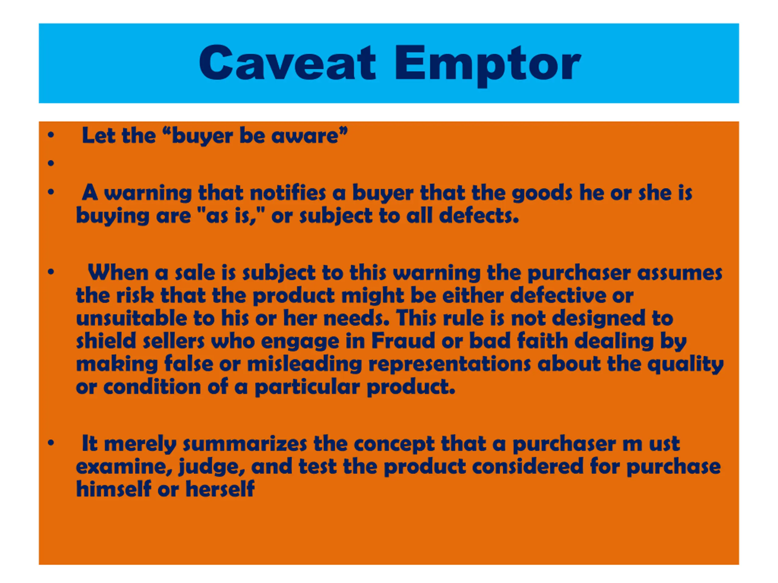Caveat Emptor Let the buyer be aware A warning that notifies a buyer that the goods he or she is buying are "as is," or subject to all defects. When a sale is subject to this warning the purchaser assumes the risk that the product might be either defective or unsuitable to his or her needs. This rule is not designed to shield sellers who engage in Fraud or bad faith dealing by making false or misleading representations about the quality or condition of a particular product. It merely summarizes the concept that a purchaser m ust examine, judge, and test the product considered for purchase himself or herself