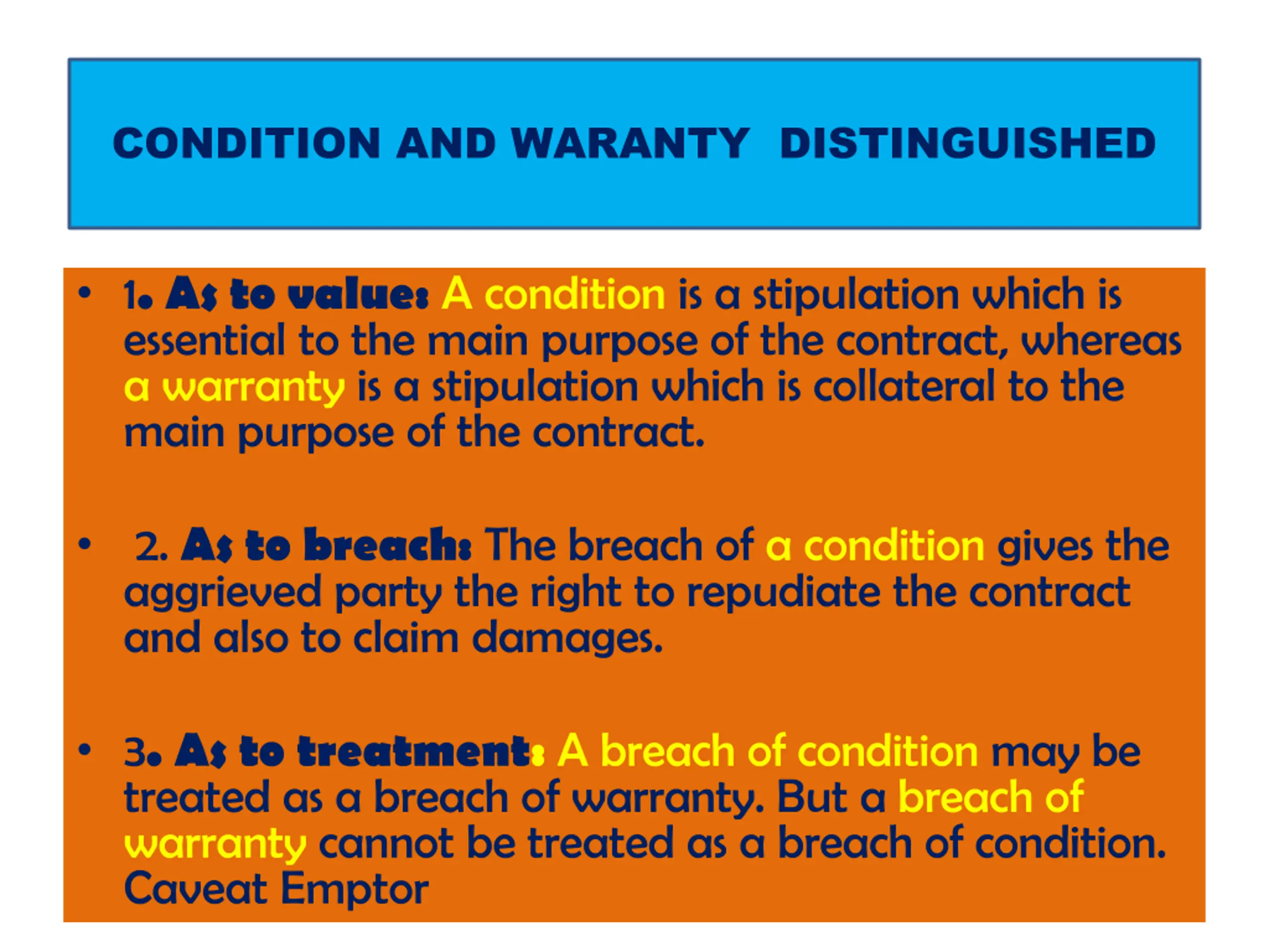 CONDITION AND WARANTY DISTINGUISHED 1. As to value: A condition is a stipulation which is essential to the main purpose of the contract, whereas a warranty is a stipulation which is collateral to the main purpose of the contract. 2. As to breach: The breach of a condition gives the aggrieved party the right to repudiate the contract and also to claim damages. 3. As to treatment: A breach of condition may be treated as a breach of warranty. But a breach of warranty cannot be treated as a breach of condition. Caveat Emptor