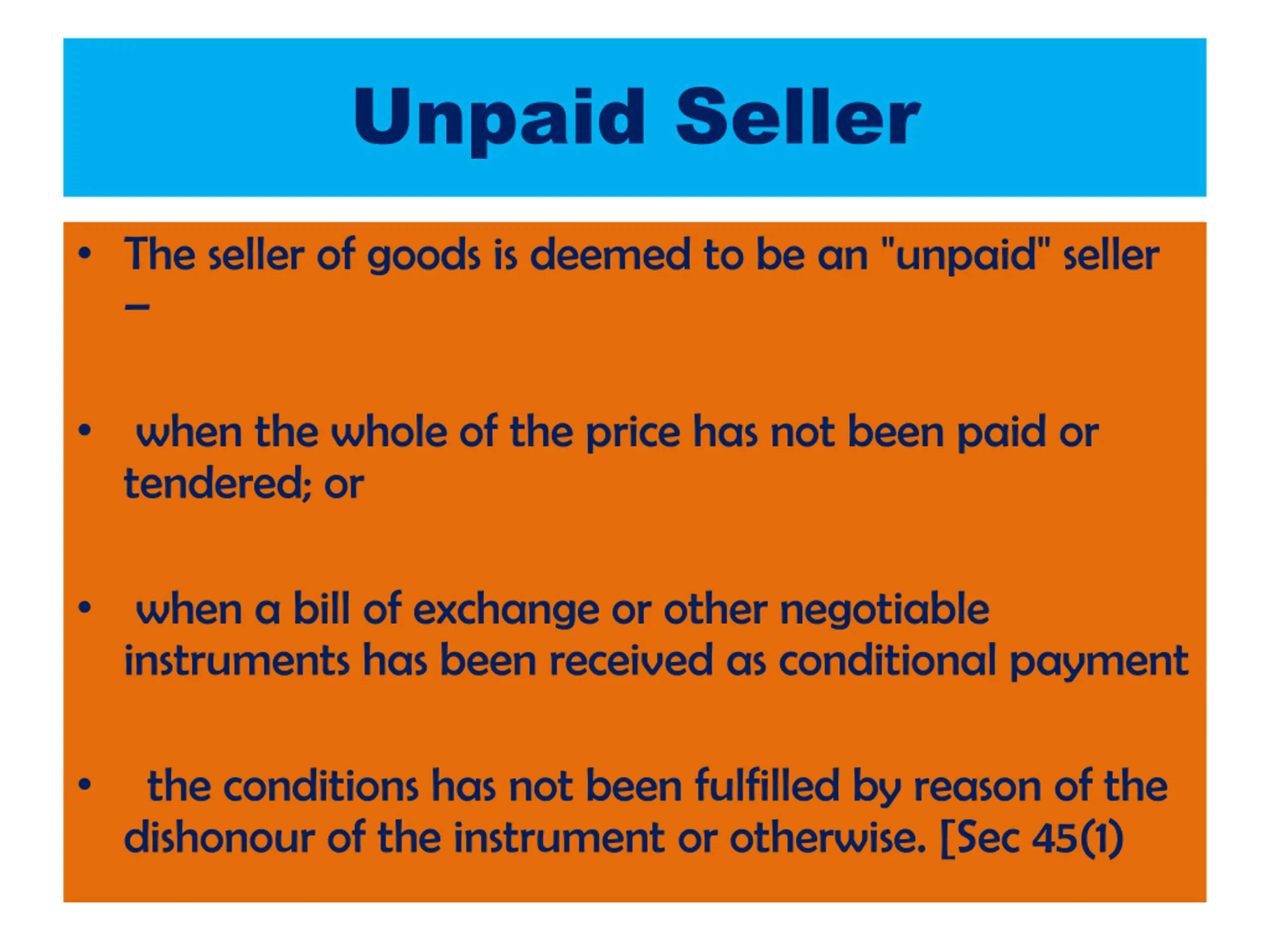Unpaid Seller The seller of goods is deemed to be an "unpaid" seller when the whole of the price has not been paid or tendered; or when a bill of exchange or other negotiable instruments has been received as conditional payment the conditions has not been fulfilled by reason of the dishonour of the instrument or otherwise. [Sec 45(1)