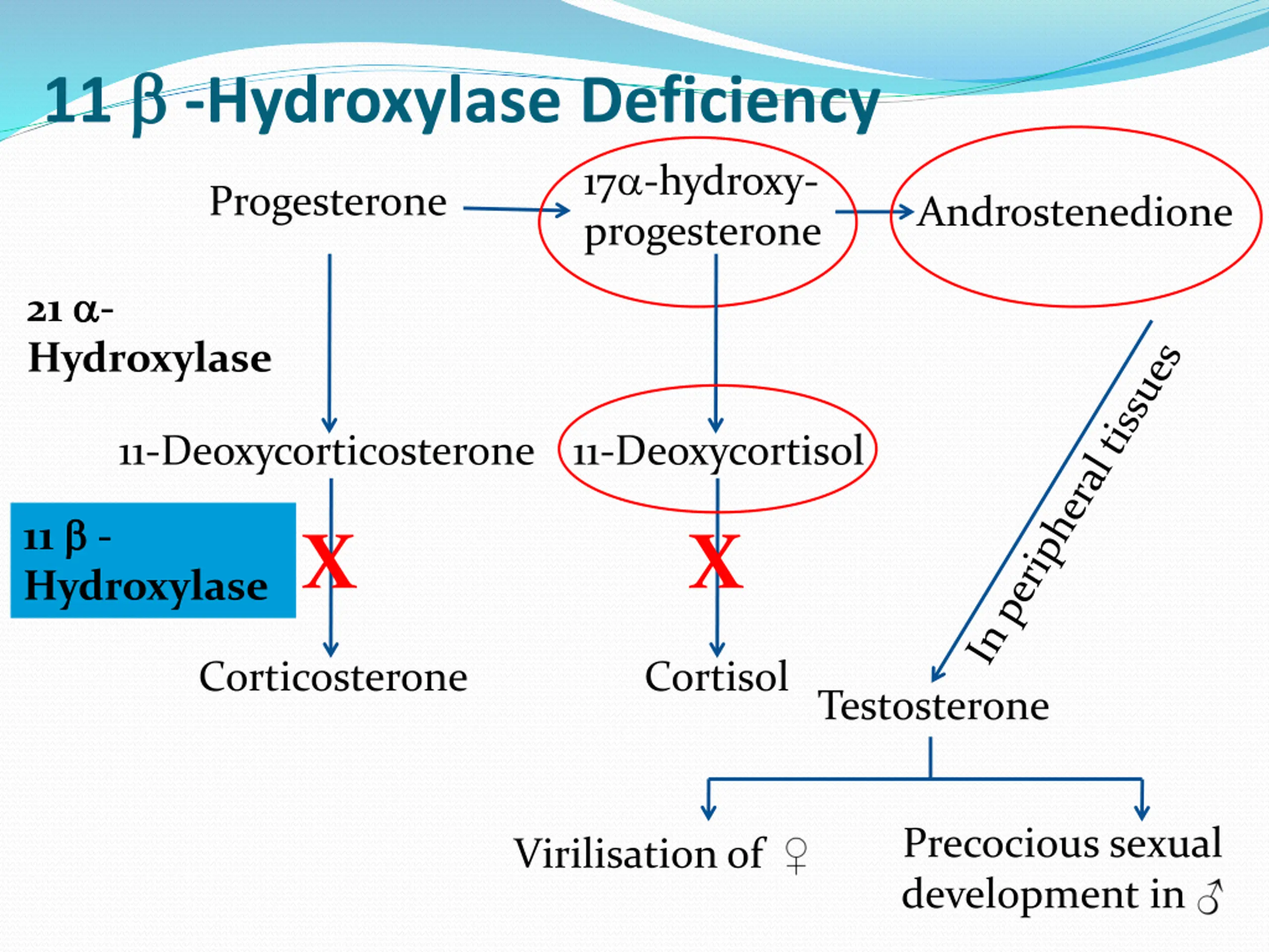 11 -Hydroxylase Deficiency 17 -hydroxy- progesterone Progesterone Androstenedione 21 - Hydroxylase 11-Deoxycorticosterone 11-Deoxycortisol 11 - Hydroxylase X X Corticosterone Cortisol Testosterone Precocious sexual development in Virilisation of