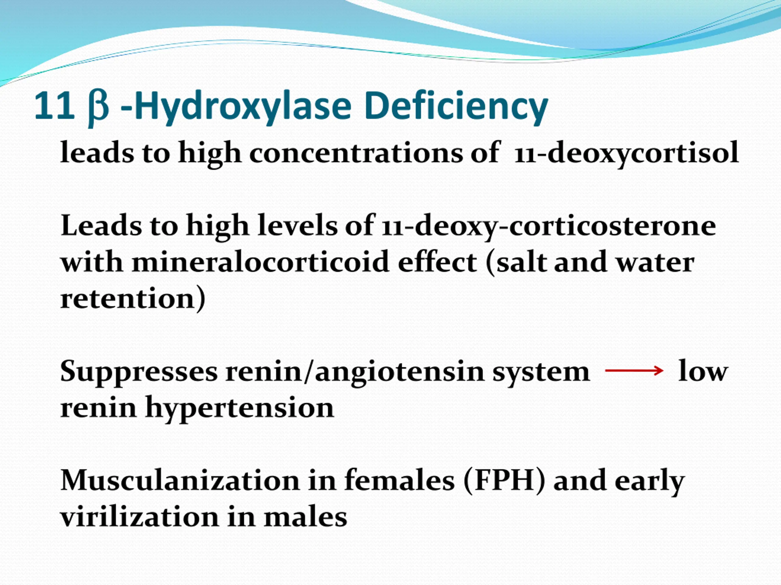11 -Hydroxylase Deficiency leads to high concentrations of 11-deoxycortisol Leads to high levels of 11-deoxy-corticosterone with mineralocorticoid effect (salt and water retention) Suppresses renin/angiotensin system low renin hypertension Musculanization in females (FPH) and early virilization in males