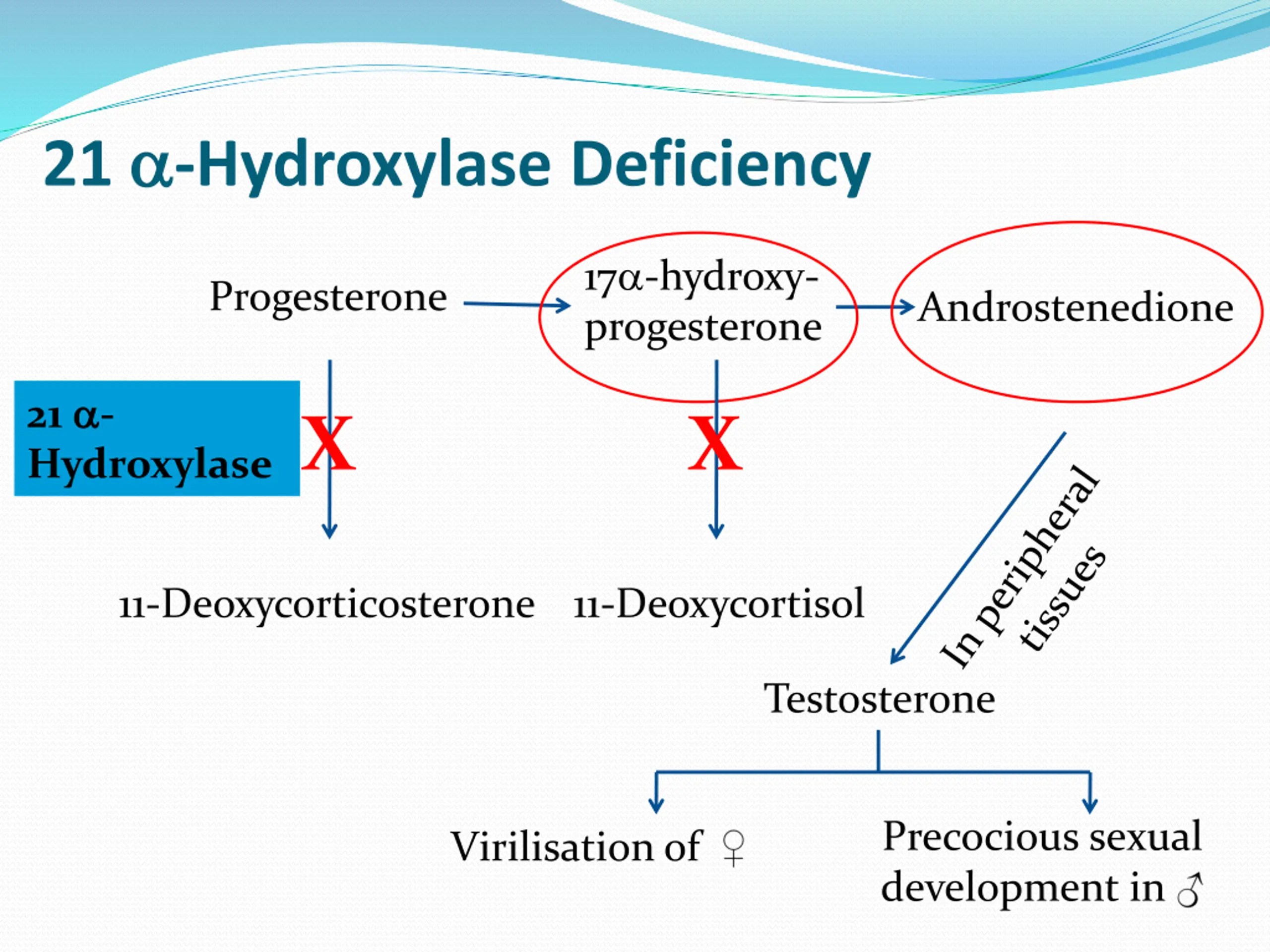 21 -Hydroxylase Deficiency 17 -hydroxy- progesterone Progesterone Androstenedione 21 - Hydroxylase X X 11-Deoxycorticosterone 11-Deoxycortisol Testosterone Precocious sexual development in Virilisation of