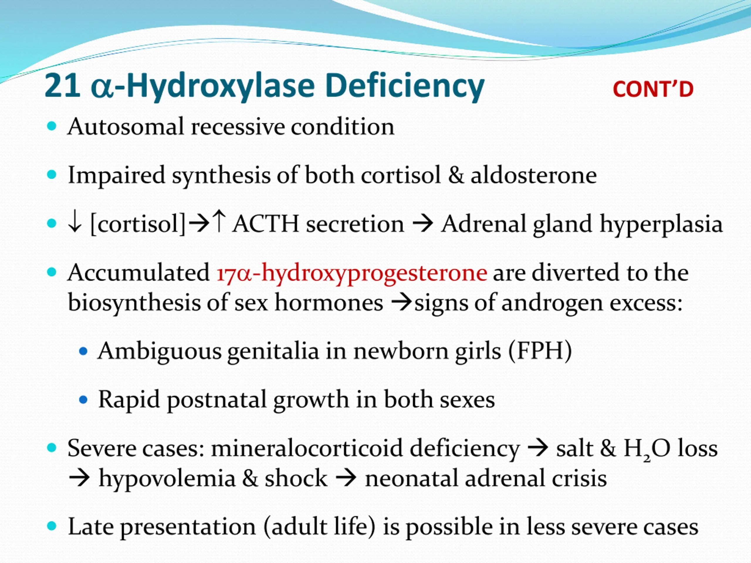 21 -Hydroxylase Deficiency CONTD Autosomal recessive condition Impaired synthesis of both cortisol & aldosterone [cortisol] ACTH secretion Adrenal gland hyperplasia Accumulated 17 -hydroxyprogesterone are diverted to the biosynthesis of sex hormones signs of androgen excess: Ambiguous genitalia in newborn girls (FPH) Rapid postnatal growth in both sexes Severe cases: mineralocorticoid deficiency salt & H2O loss hypovolemia & shock neonatal adrenal crisis Late presentation (adult life) is possible in less severe cases