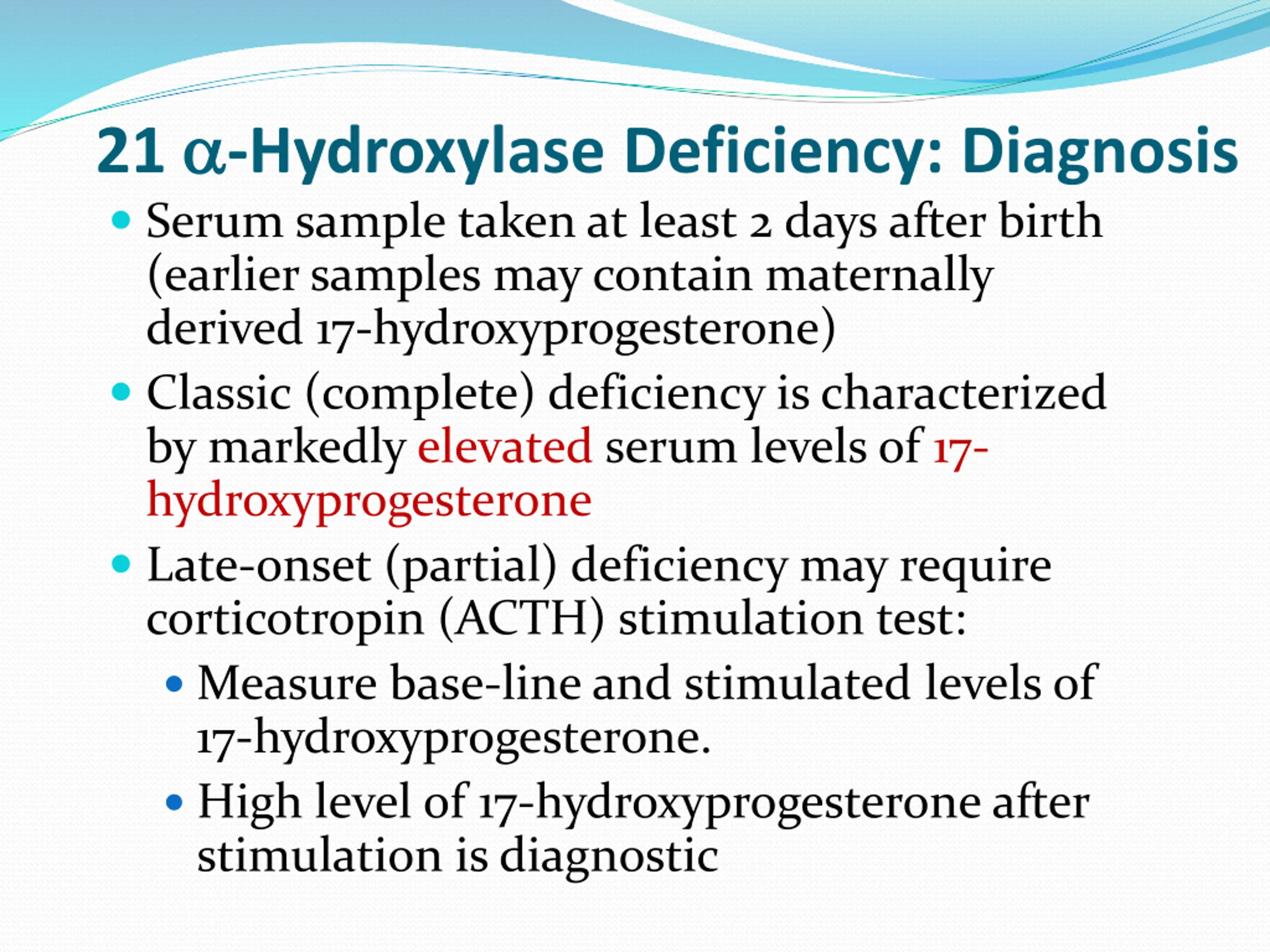 21 -Hydroxylase Deficiency: Diagnosis Serum sample taken at least 2 days after birth (earlier samples may contain maternally derived 17-hydroxyprogesterone) Classic (complete) deficiency is characterized by markedly elevated serum levels of 17- hydroxyprogesterone Late-onset (partial) deficiency may require corticotropin (ACTH) stimulation test: Measure base-line and stimulated levels of 17-hydroxyprogesterone. High level of 17-hydroxyprogesterone after stimulation is diagnostic