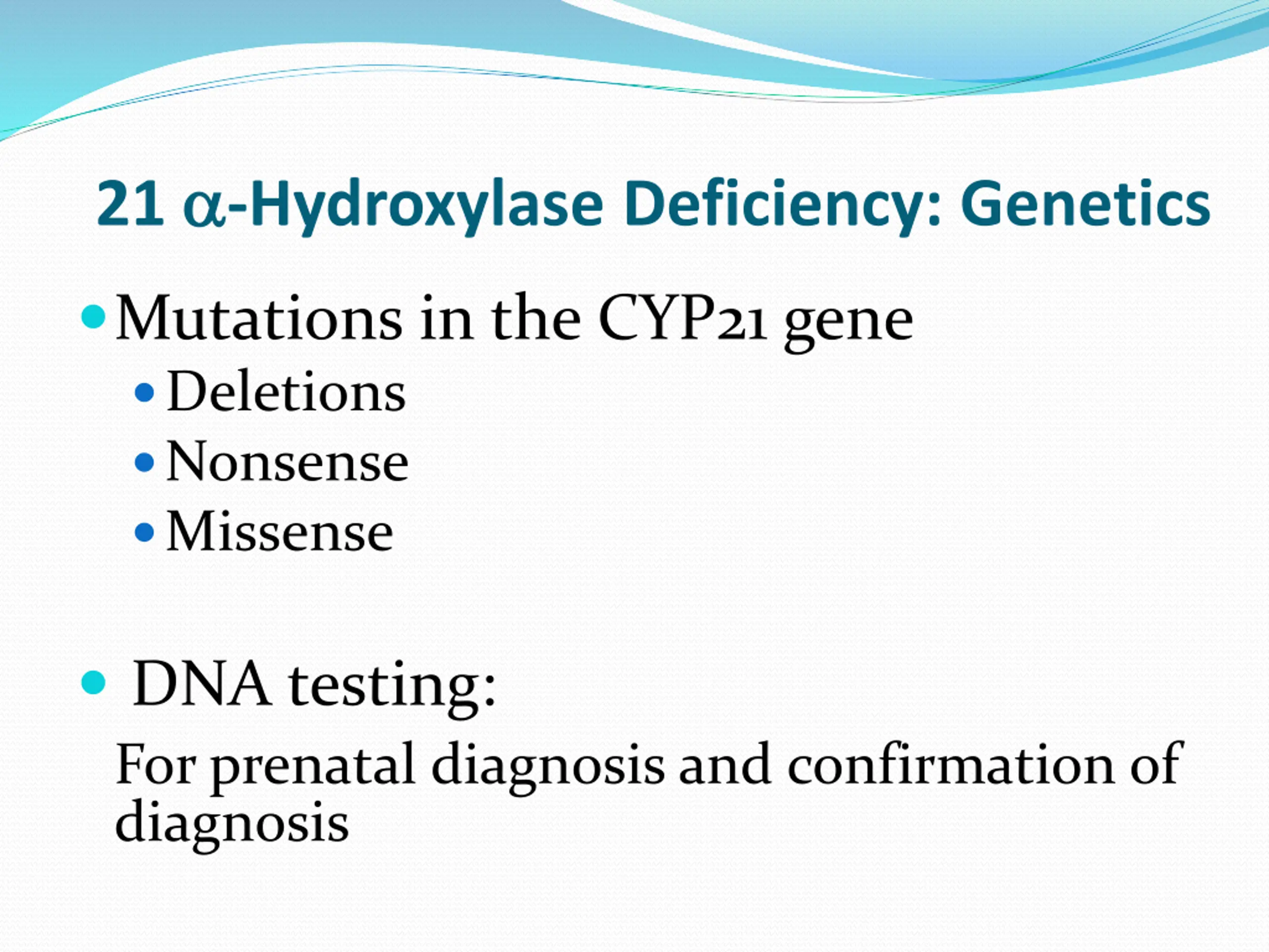 21 -Hydroxylase Deficiency: Genetics Mutations in the CYP21 gene Deletions Nonsense Missense DNA testing: For prenatal diagnosis and confirmation of diagnosis