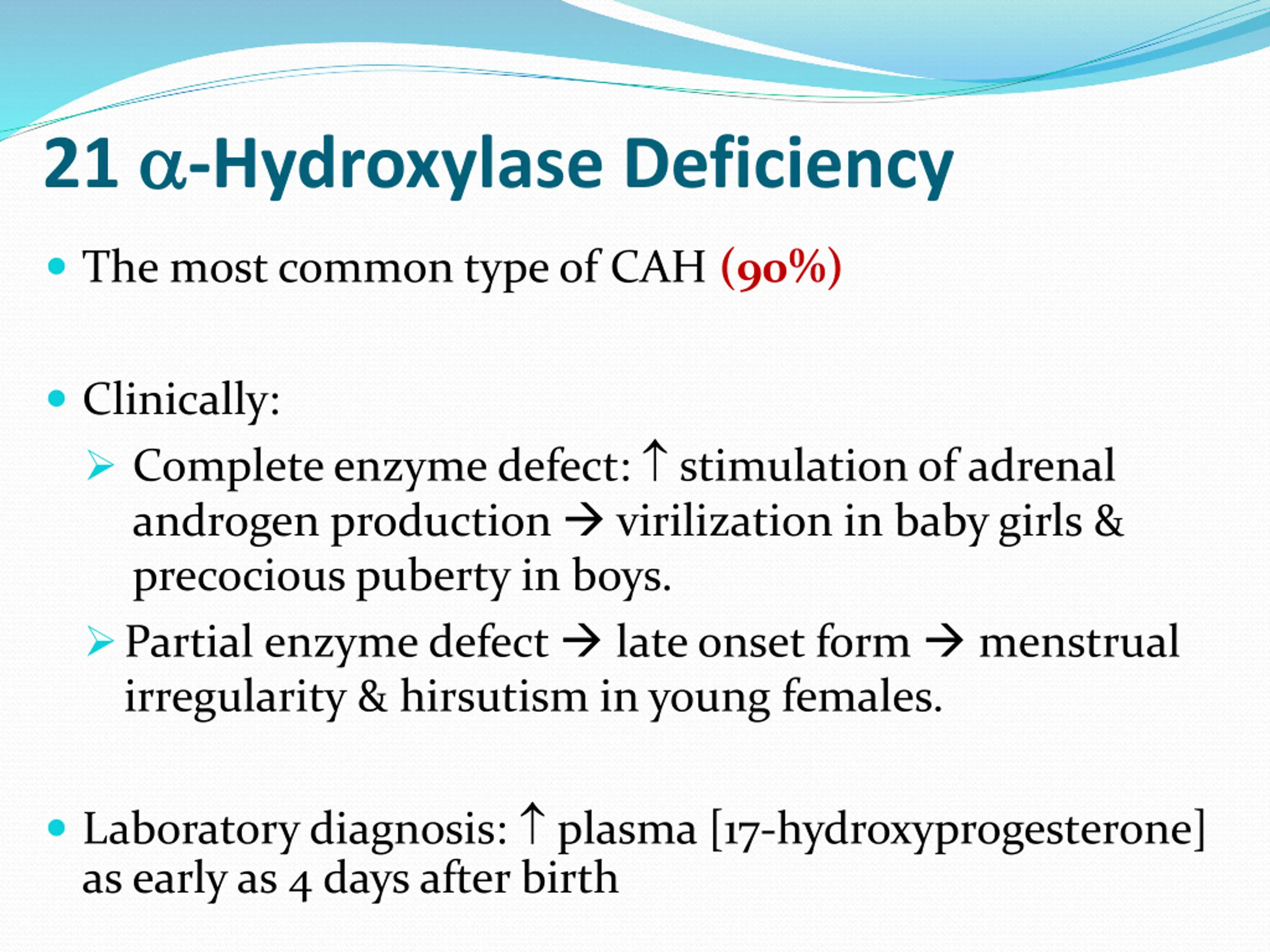21 -Hydroxylase Deficiency The most common type of CAH (90%) Clinically: Complete enzyme defect: stimulation of adrenal androgen production virilization in baby girls & precocious puberty in boys. Partial enzyme defect late onset form menstrual irregularity & hirsutism in young females. Laboratory diagnosis: plasma [17-hydroxyprogesterone] as early as 4 days after birth