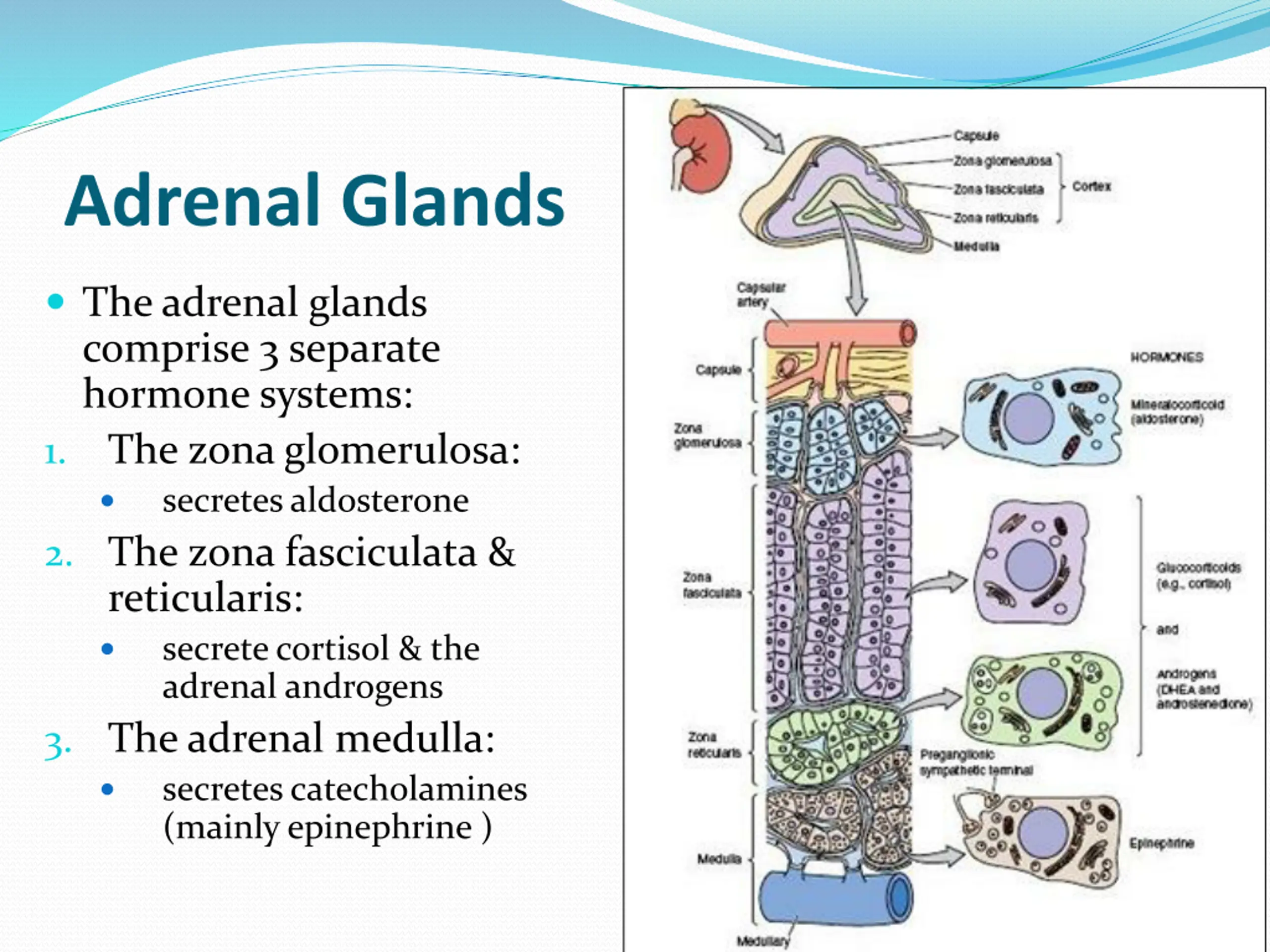 Adrenal Glands The adrenal glands comprise 3 separate hormone systems: 1. The zona glomerulosa: secretes aldosterone 2. The zona fasciculata & reticularis: secrete cortisol & the adrenal androgens 3. The adrenal medulla: secretes catecholamines (mainly epinephrine )