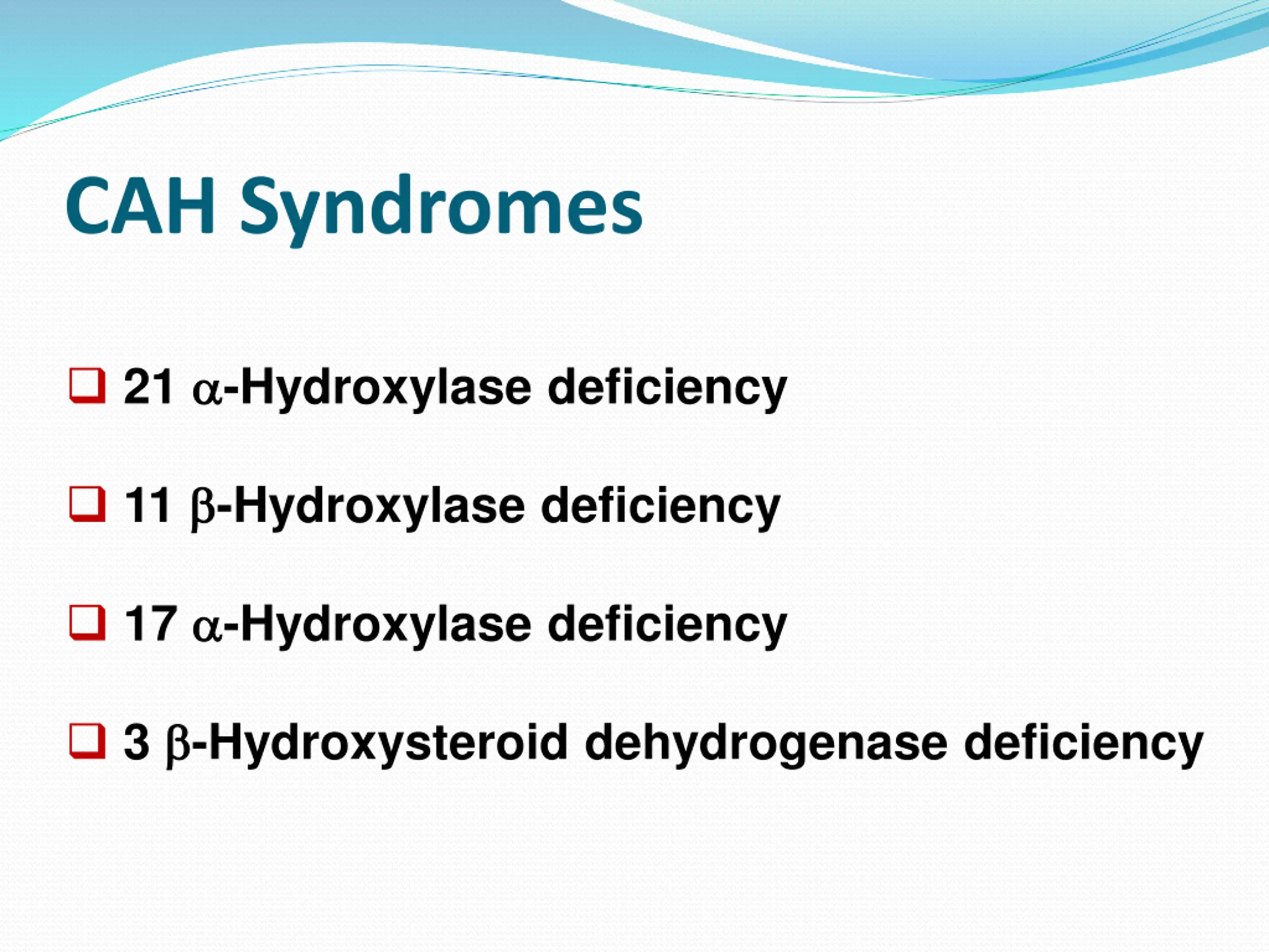 CAH Syndromes 21 -Hydroxylase deficiency 11 -Hydroxylase deficiency 17 -Hydroxylase deficiency 3 -Hydroxysteroid dehydrogenase deficiency