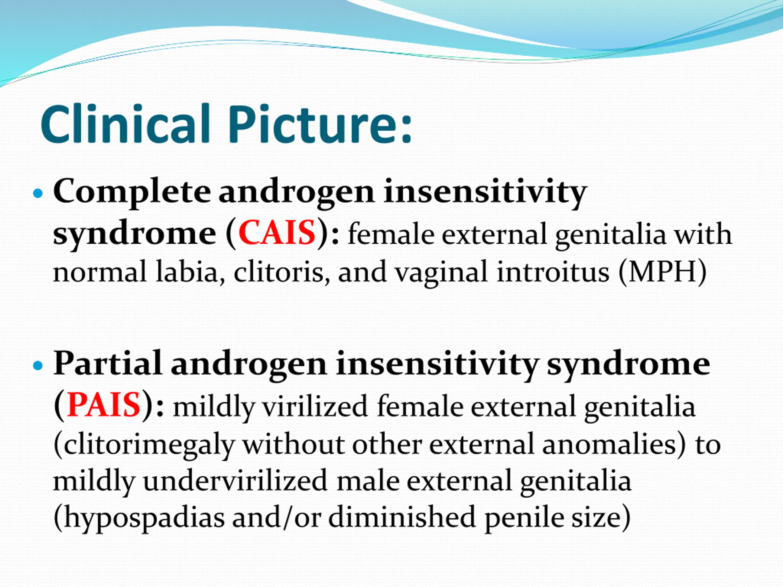 Clinical Picture: Complete androgen insensitivity syndrome (CAIS): female external genitalia with normal labia, clitoris, and vaginal introitus (MPH) Partial androgen insensitivity syndrome (PAIS): mildly virilized female external genitalia (clitorimegaly without other external anomalies) to mildly undervirilized male external genitalia (hypospadias and/or diminished penile size)
