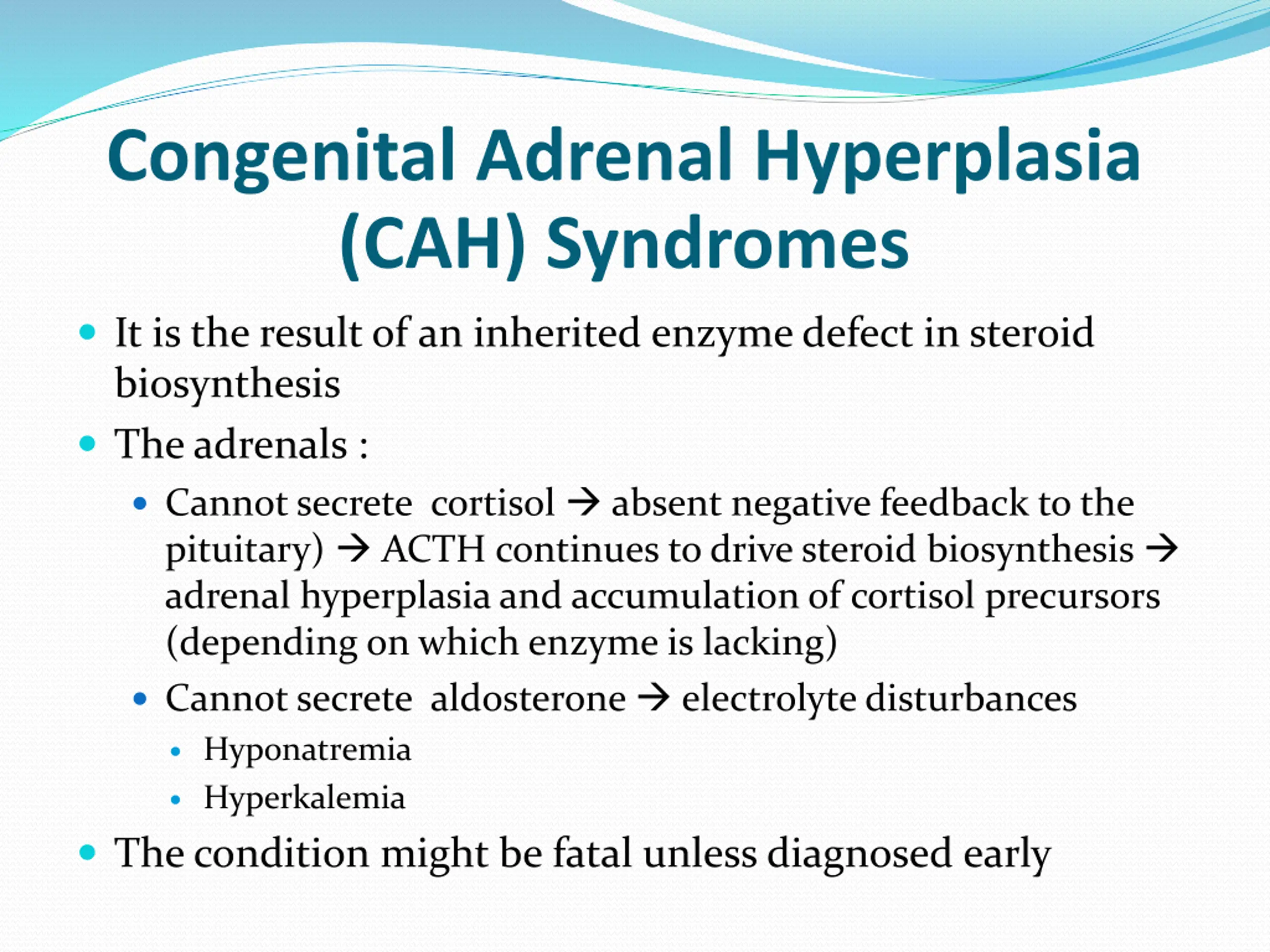 Congenital Adrenal Hyperplasia (CAH) Syndromes It is the result of an inherited enzyme defect in steroid biosynthesis The adrenals : Cannot secrete cortisol absent negative feedback to the pituitary) ACTH continues to drive steroid biosynthesis adrenal hyperplasia and accumulation of cortisol precursors (depending on which enzyme is lacking) Cannot secrete aldosterone electrolyte disturbances Hyponatremia Hyperkalemia The condition might be fatal unless diagnosed early