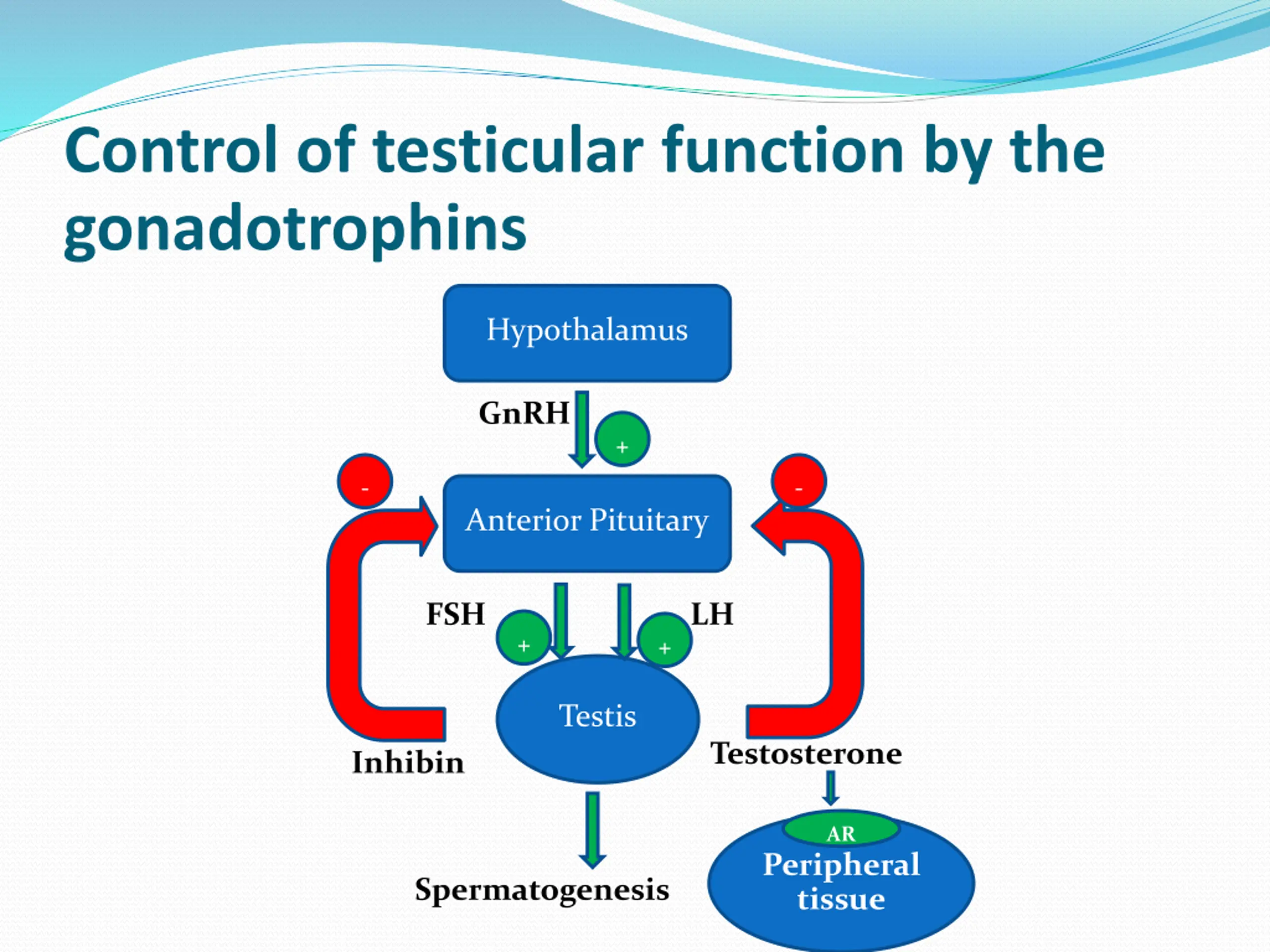 Control of testicular function by the gonadotrophins Hypothalamus GnRH + - - Anterior Pituitary FSH LH + + Testis Testosterone Inhibin AR Peripheral tissue Spermatogenesis