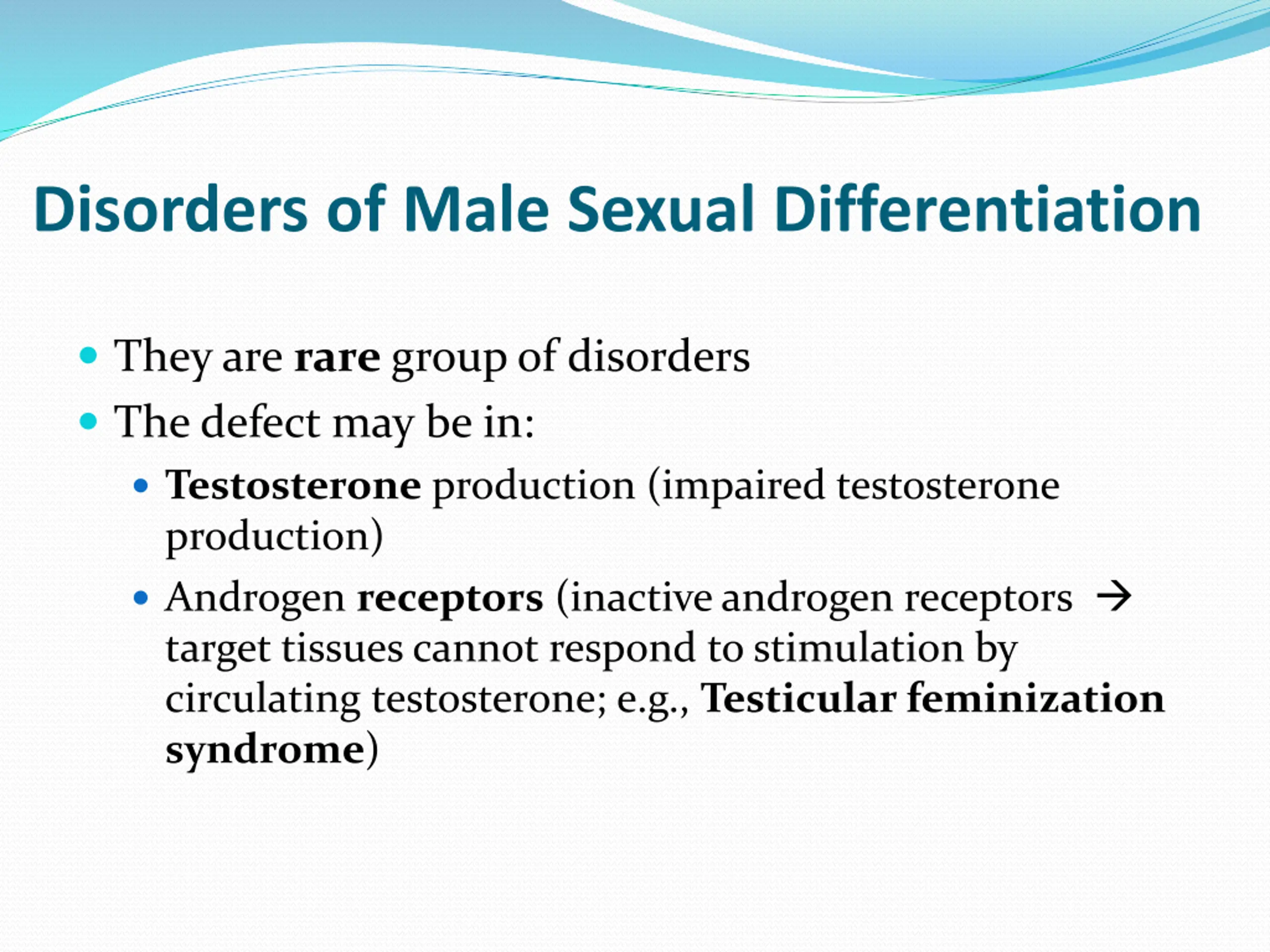 Disorders of Male Sexual Differentiation They are rare group of disorders The defect may be in: Testosterone production (impaired testosterone production) Androgen receptors (inactive androgen receptors target tissues cannot respond to stimulation by circulating testosterone; e.g., Testicular feminization syndrome)