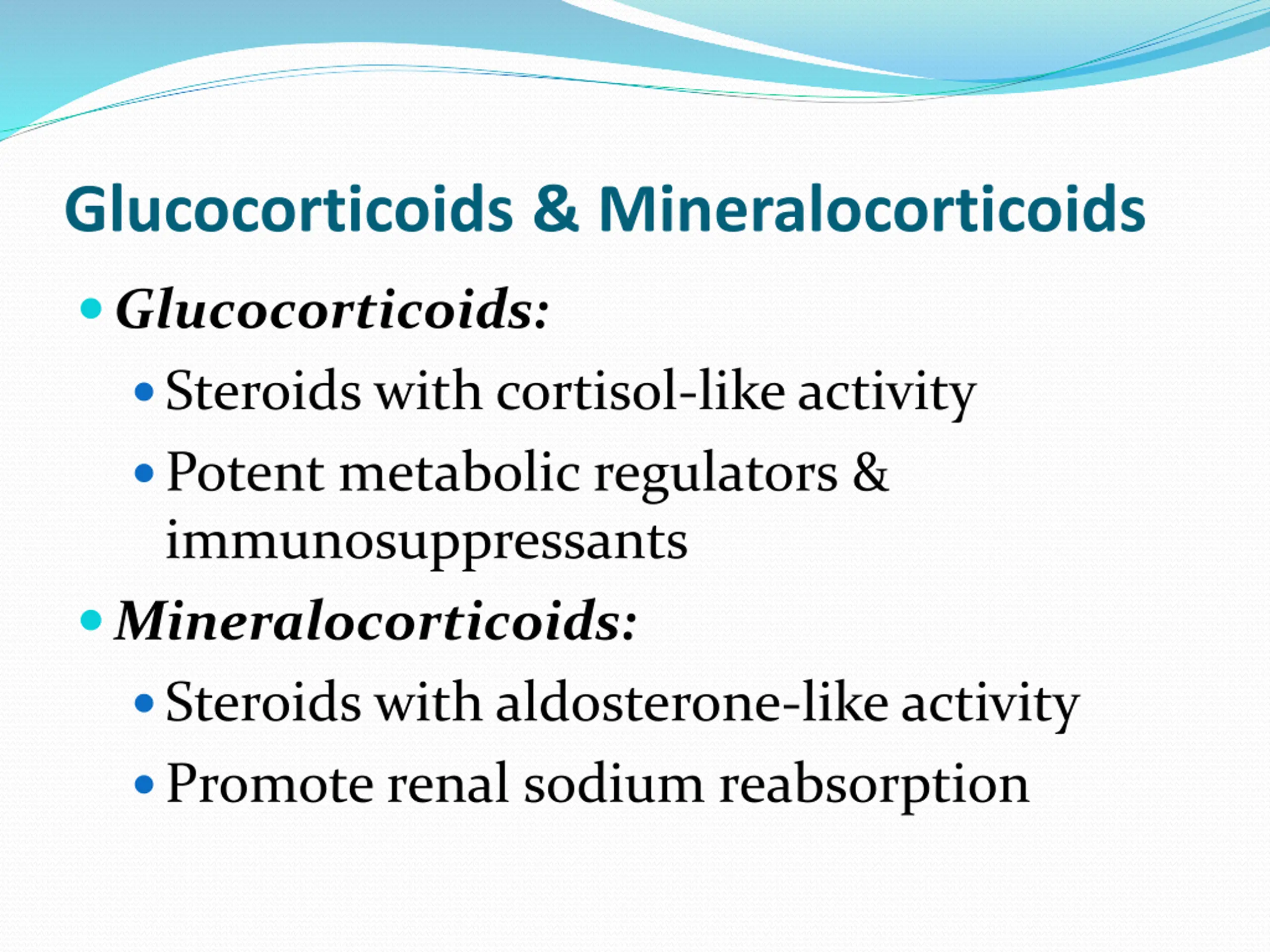 Glucocorticoids & Mineralocorticoids Glucocorticoids: Steroids with cortisol-like activity Potent metabolic regulators & immunosuppressants Mineralocorticoids: Steroids with aldosterone-like activity Promote renal sodium reabsorption
