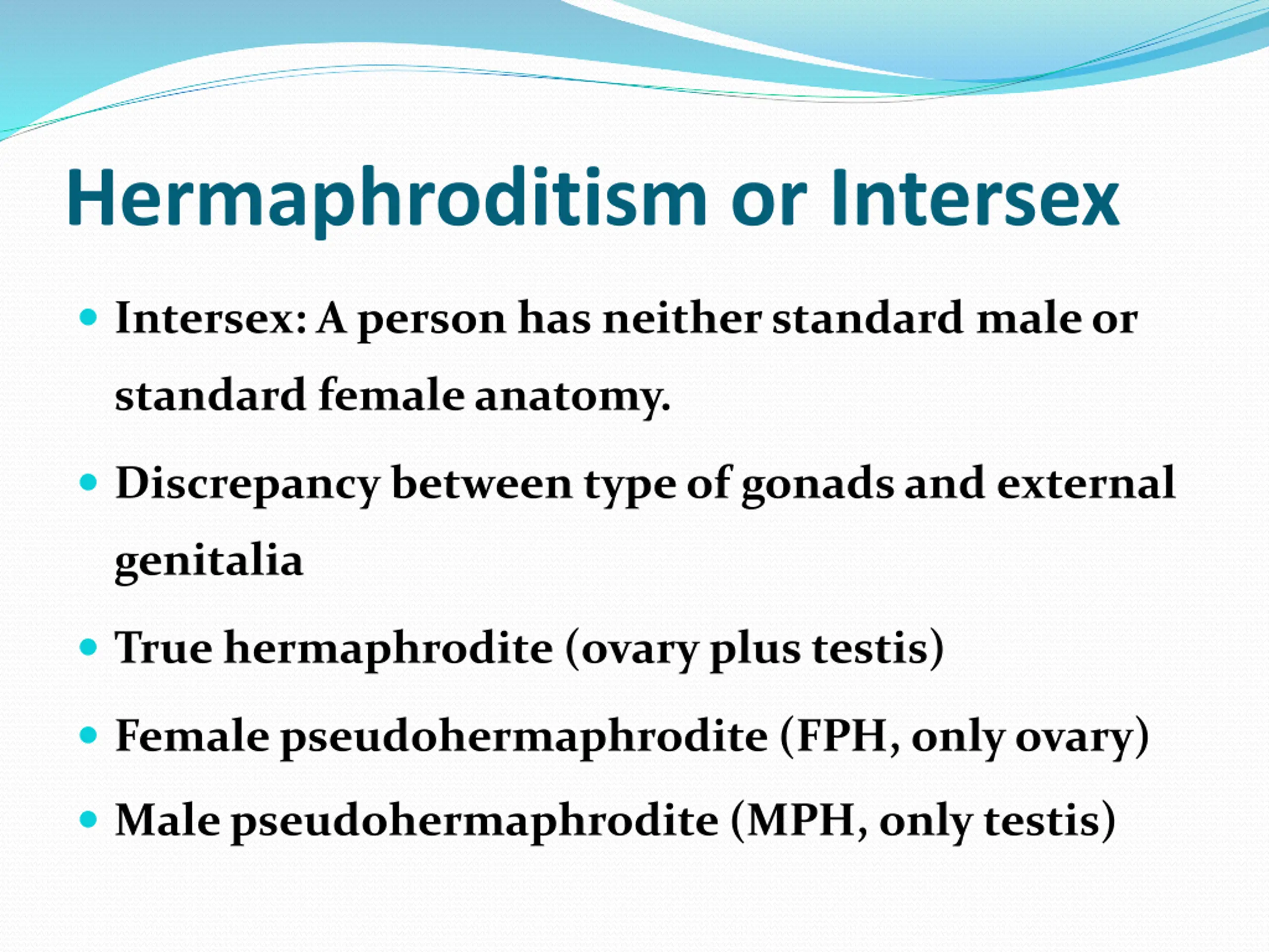 Hermaphroditism or Intersex Intersex: A person has neither standard male or standard female anatomy. Discrepancy between type of gonads and external genitalia True hermaphrodite (ovary plus testis) Female pseudohermaphrodite (FPH, only ovary) Male pseudohermaphrodite (MPH, only testis)
