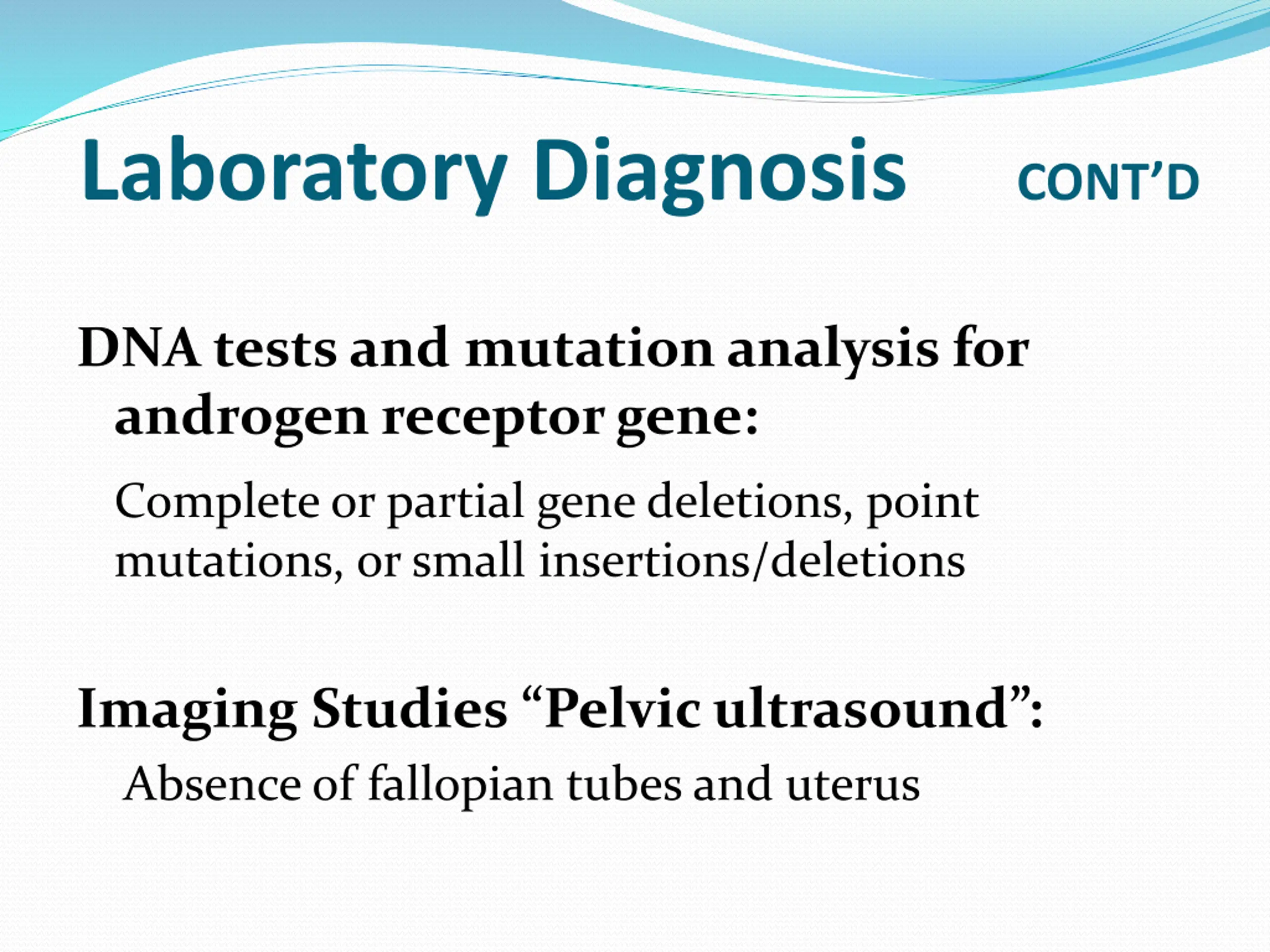 Laboratory Diagnosis CONTD DNA tests and mutation analysis for androgen receptor gene: Complete or partial gene deletions, point mutations, or small insertions/deletions Imaging Studies Pelvic ultrasound : Absence of fallopian tubes and uterus