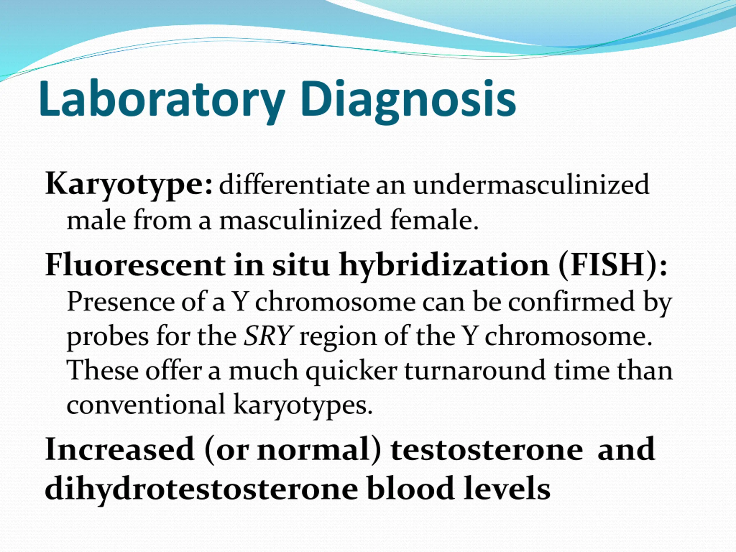 Laboratory Diagnosis Karyotype: differentiate an undermasculinized male from a masculinized female. Fluorescent in situ hybridization (FISH): Presence of a Y chromosome can be confirmed by probes for the SRY region of the Y chromosome. These offer a much quicker turnaround time than conventional karyotypes. Increased (or normal) testosterone and dihydrotestosterone blood levels