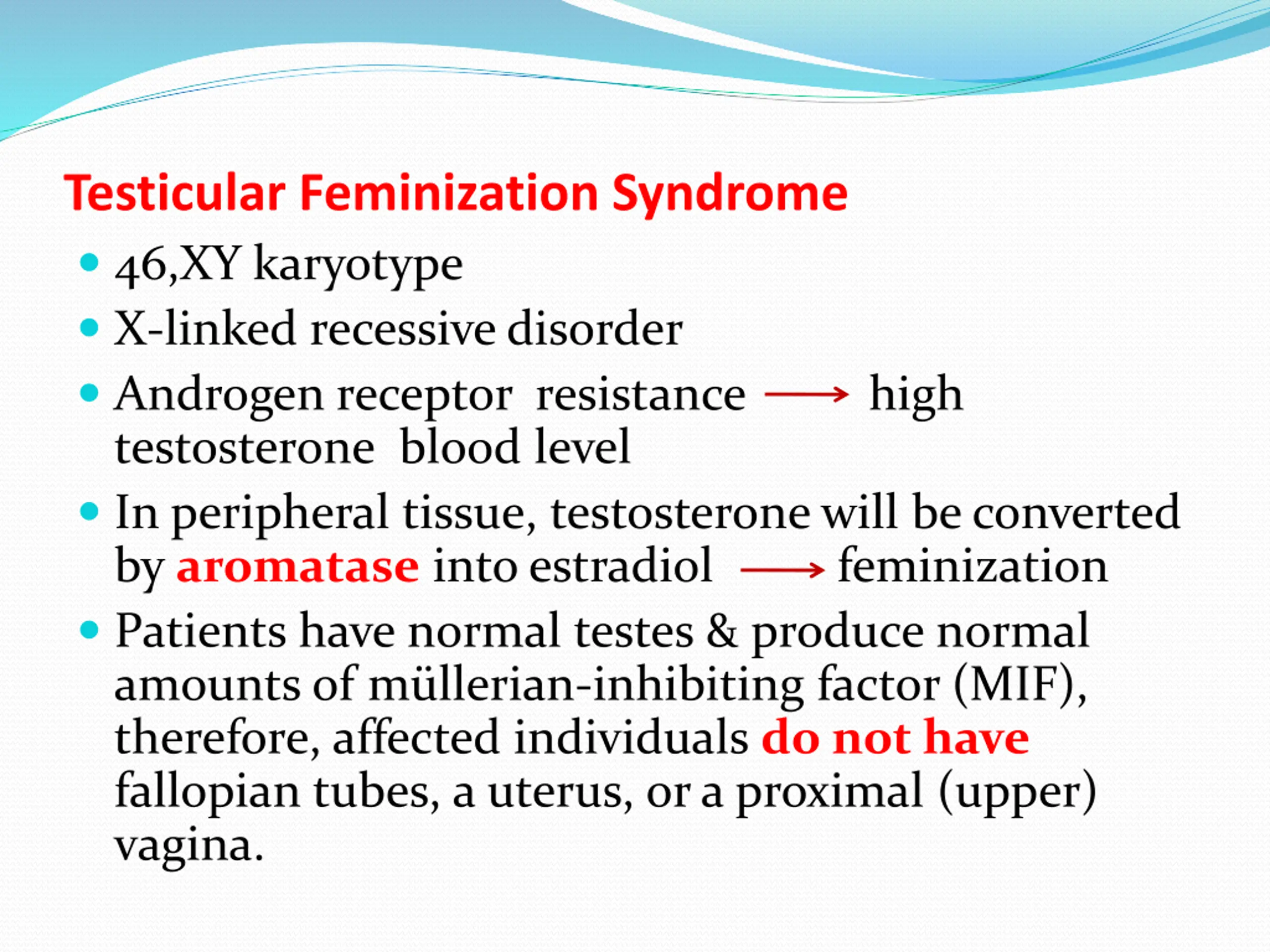 Testicular Feminization Syndrome 46,XY karyotype X-linked recessive disorder Androgen receptor resistance high testosterone blood level In peripheral tissue, testosterone will be converted by aromatase into estradiol feminization Patients have normal testes & produce normal amounts of m llerian-inhibiting factor (MIF), therefore, affected individuals do not have fallopian tubes, a uterus, or a proximal (upper) vagina.