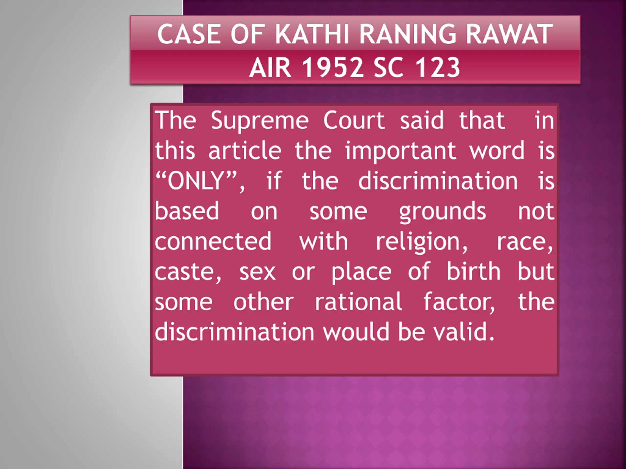 CASE OF KATHI RANING RAWAT AIR 1952 SC 123 The Supreme Court said that this article the important word is ONLY , if the discrimination is based on some connected with caste, sex or place of birth but some other rational factor, the discrimination would be valid. in grounds religion, not race,