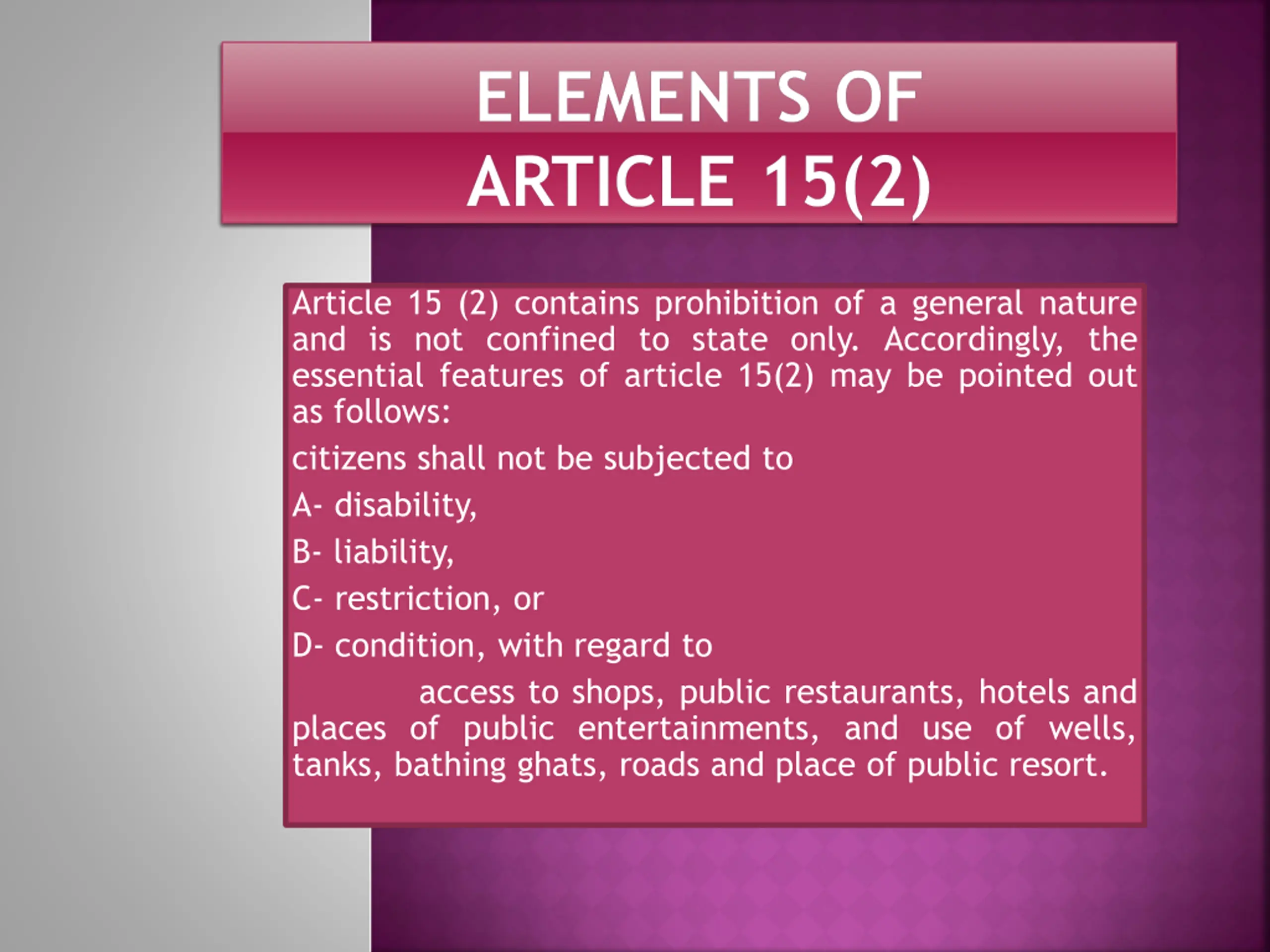 ELEMENTS OF ARTICLE 15(2) Article 15 (2) contains prohibition of a general nature and is not confined to state only. Accordingly, the essential features of article 15(2) may be pointed out as follows: citizens shall not be subjected to A- disability, B- liability, C- restriction, or D- condition, with regard to access to shops, public restaurants, hotels and places of public entertainments, and use of wells, tanks, bathing ghats, roads and place of public resort.