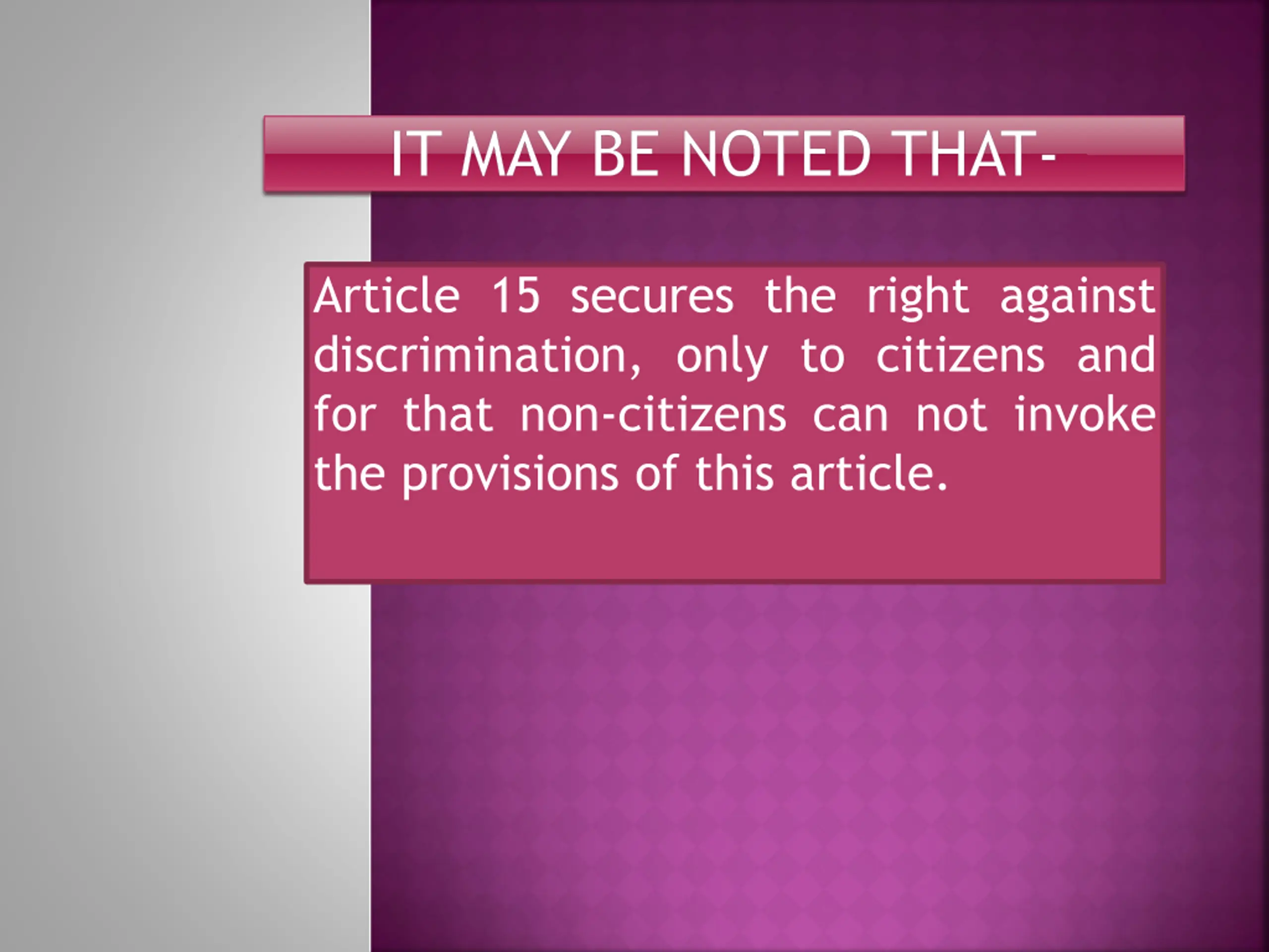 IT MAY BE NOTED THAT- Article 15 secures the right against discrimination, only to citizens and for that non-citizens can not invoke the provisions of this article.