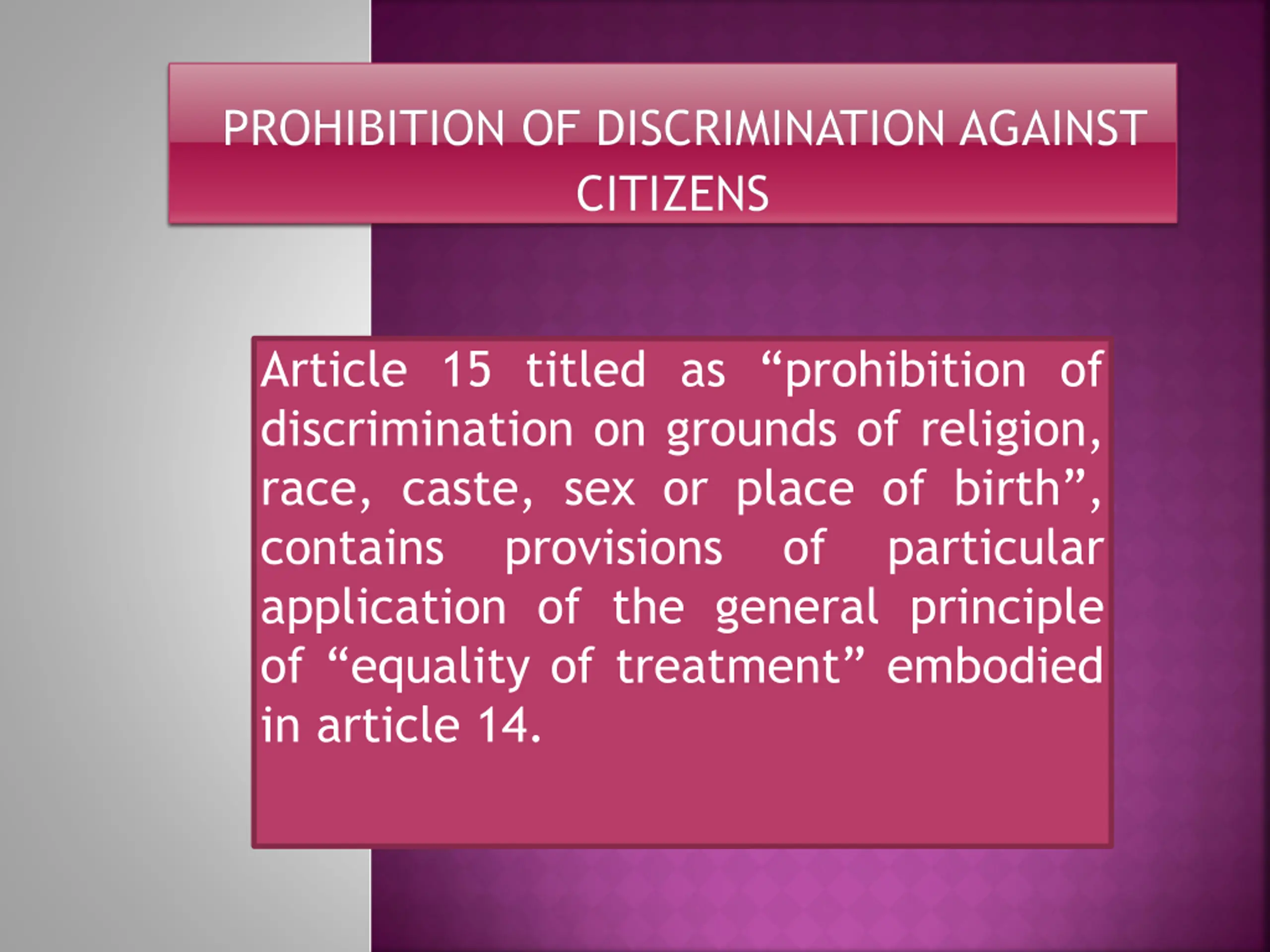 PROHIBITION OF DISCRIMINATION AGAINST CITIZENS Article 15 titled as prohibition of discrimination on grounds of religion, race, caste, sex or place of birth , contains provisions application of the general principle of equality of treatment embodied in article 14. of particular