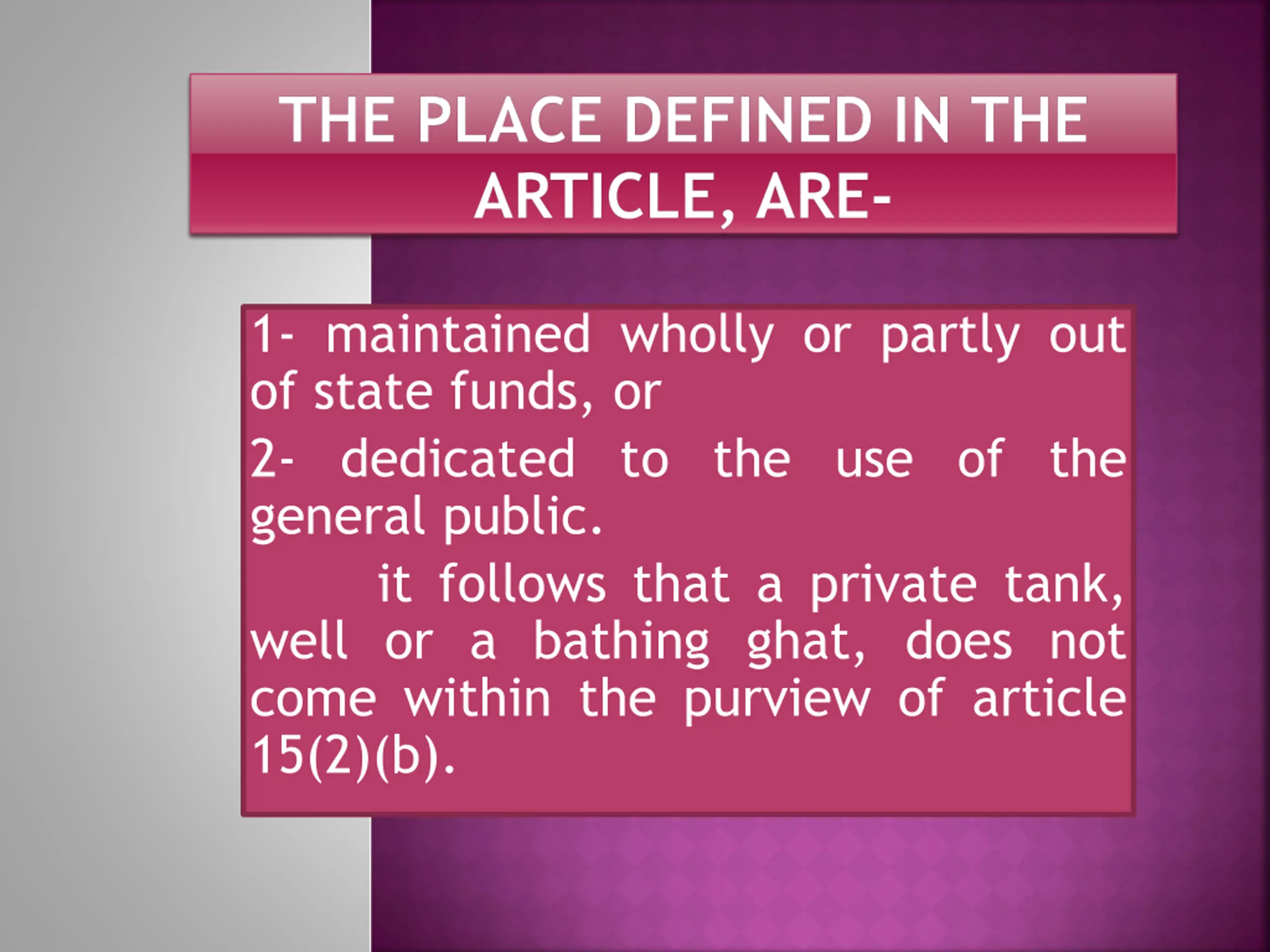 THE PLACE DEFINED IN THE ARTICLE, ARE- 1- maintained wholly or partly out of state funds, or 2- dedicated to the use of the general public. it follows that a private tank, well or a bathing ghat, does not come within the purview of article 15(2)(b).