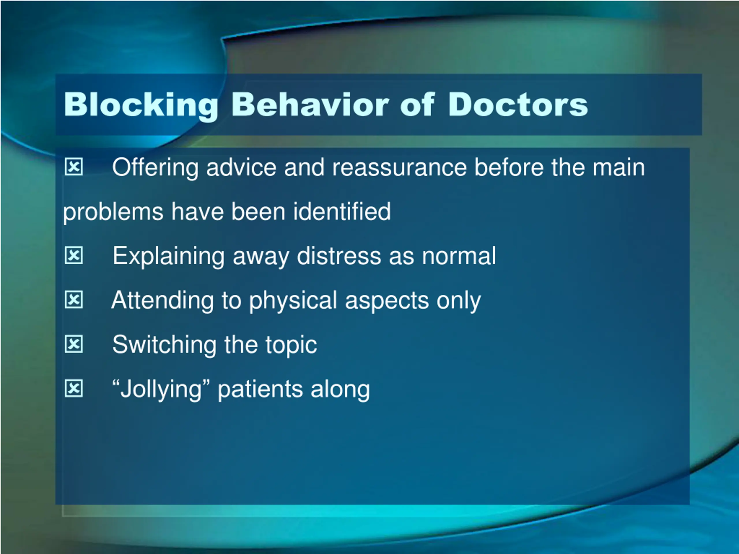 Blocking Behavior of Doctors Offering advice and reassurance before the main problems have been identified Explaining away distress as normal Attending to physical aspects only Switching the topic Jollying patients along