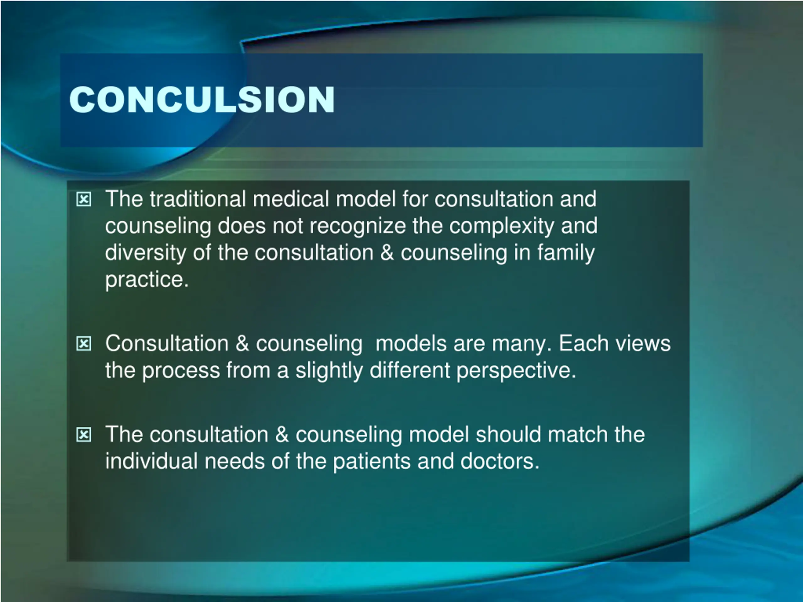 CONCULSION The traditional medical model for consultation and counseling does not recognize the complexity and diversity of the consultation & counseling in family practice. Consultation & counseling models are many. Each views the process from a slightly different perspective. The consultation & counseling model should match the individual needs of the patients and doctors.