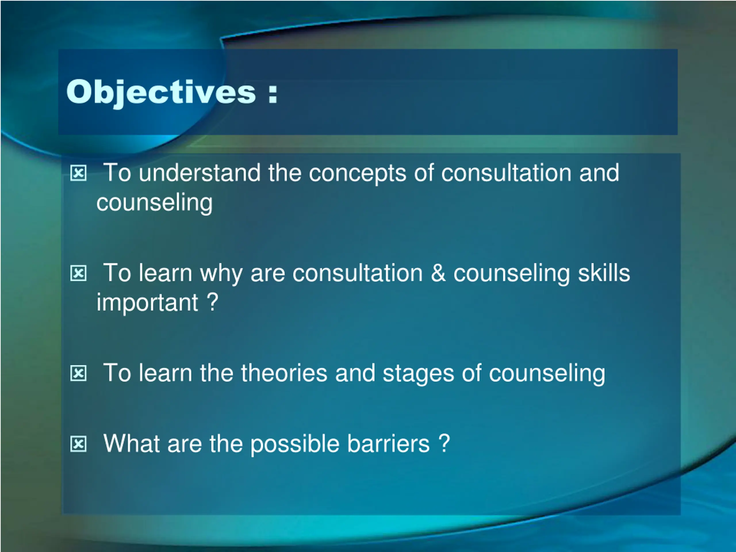 Objectives : To understand the concepts of consultation and counseling To learn why are consultation & counseling skills important ? To learn the theories and stages of counseling What are the possible barriers ?