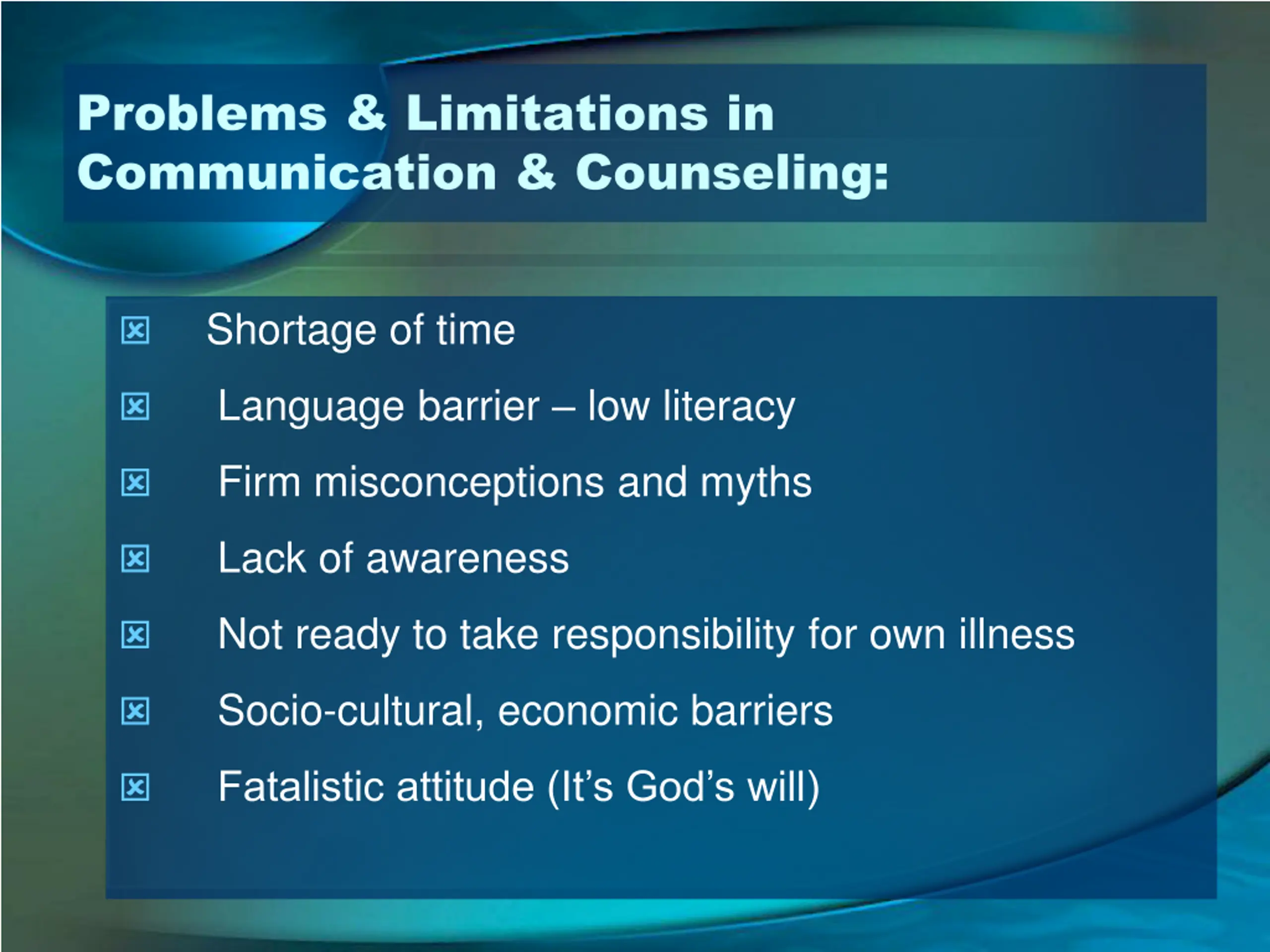 Problems & Limitations in Communication & Counseling: Shortage of time Language barrier low literacy Firm misconceptions and myths Lack of awareness Not ready to take responsibility for own illness Socio-cultural, economic barriers Fatalistic attitude (It s God s will)