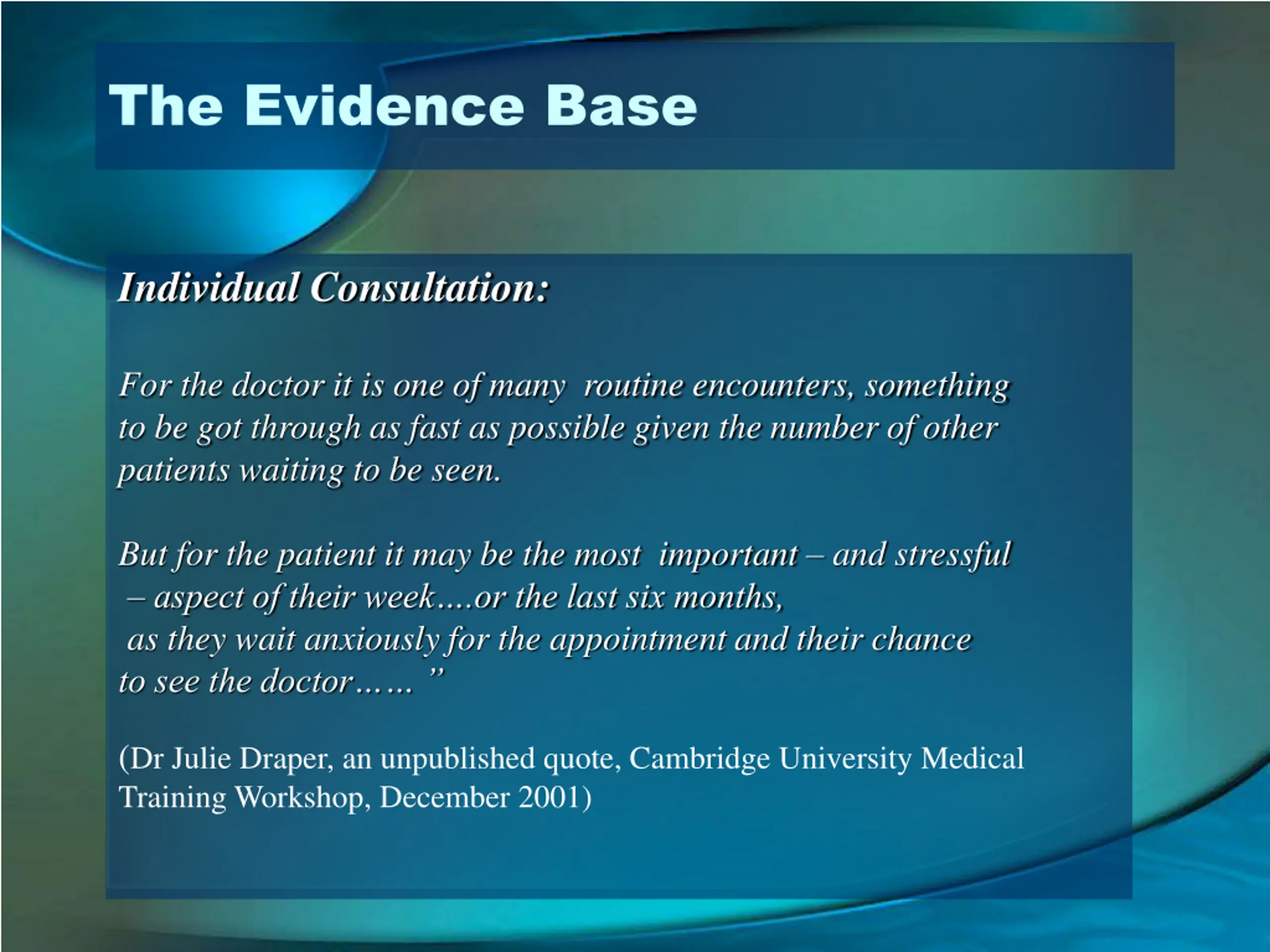 The Evidence Base Individual Consultation: For the doctor it is one of many routine encounters, something to be got through as fast as possible given the number of other patients waiting to be seen. But for the patient it may be the most important and stressful aspect of their week .or the last six months, as they wait anxiously for the appointment and their chance to see the doctor (Dr Julie Draper, an unpublished quote, Cambridge University Medical Training Workshop, December 2001)