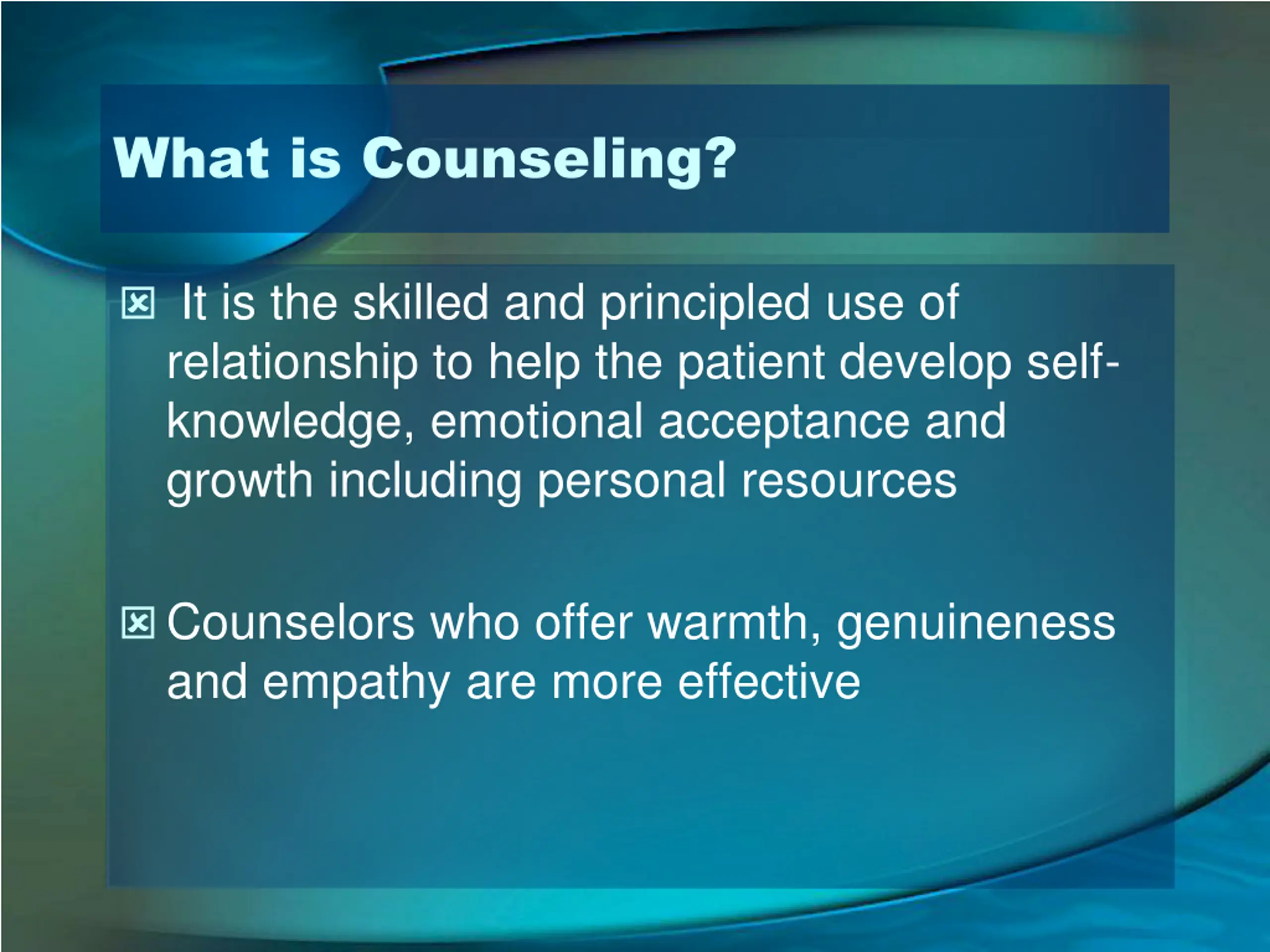 What is Counseling? It is the skilled and principled use of relationship to help the patient develop self- knowledge, emotional acceptance and growth including personal resources Counselors who offer warmth, genuineness and empathy are more effective