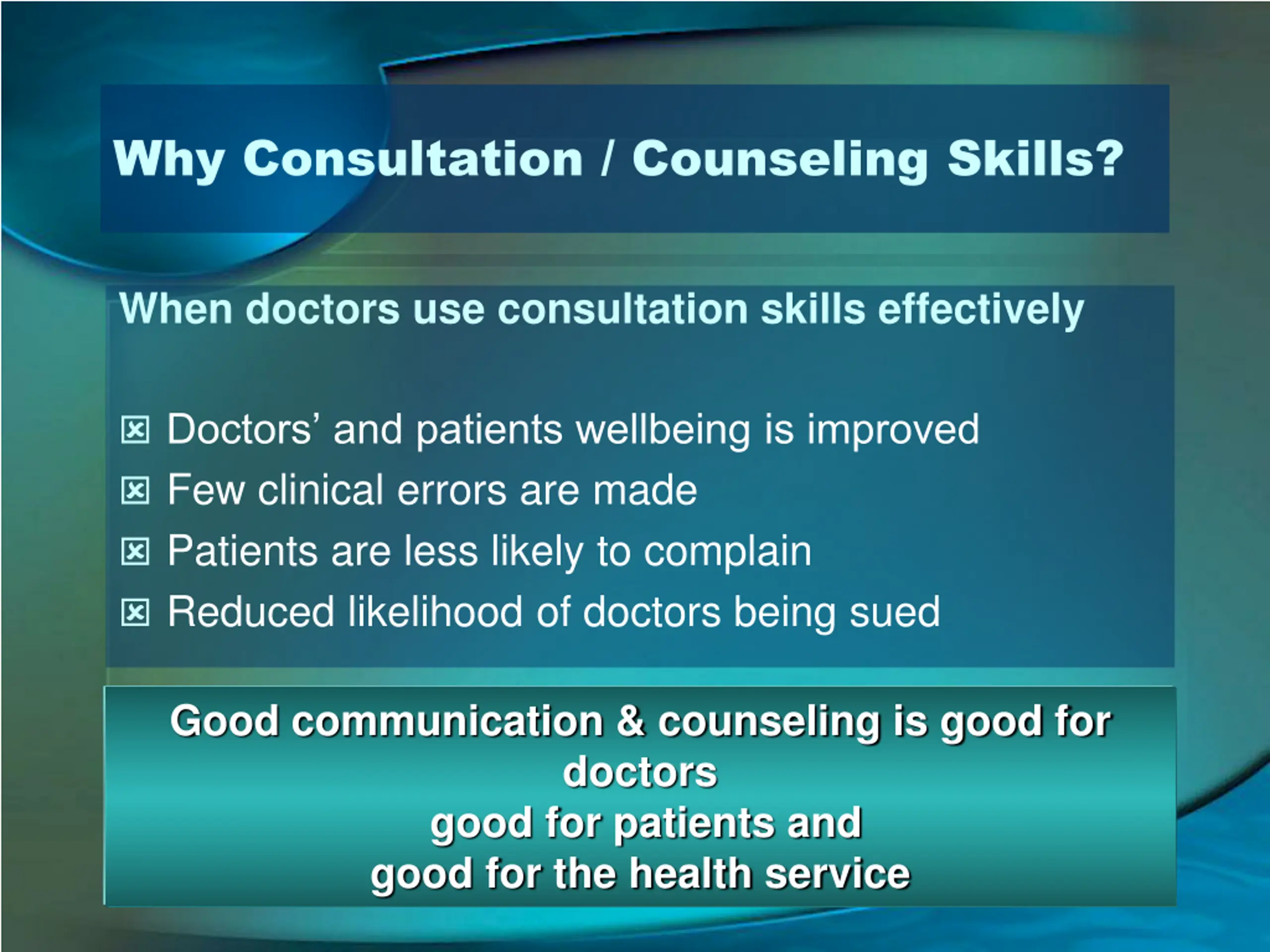 Why Consultation / Counseling Skills? When doctors use consultation skills effectively Doctors and patients wellbeing is improved Few clinical errors are made Patients are less likely to complain Reduced likelihood of doctors being sued Good communication & counseling is good for doctors good for patients and good for the health service