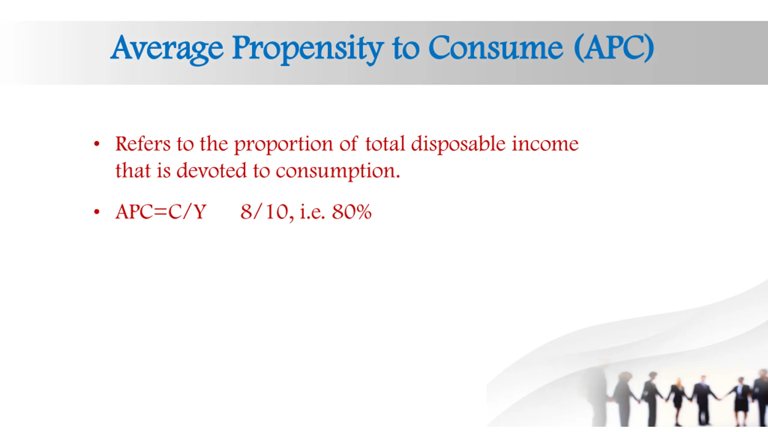Average Propensity to Consume (APC) Average Propensity to Consume (APC) Refers to the proportion of total disposable income that is devoted to consumption. APC=C/Y 8/10, i.e. 80%