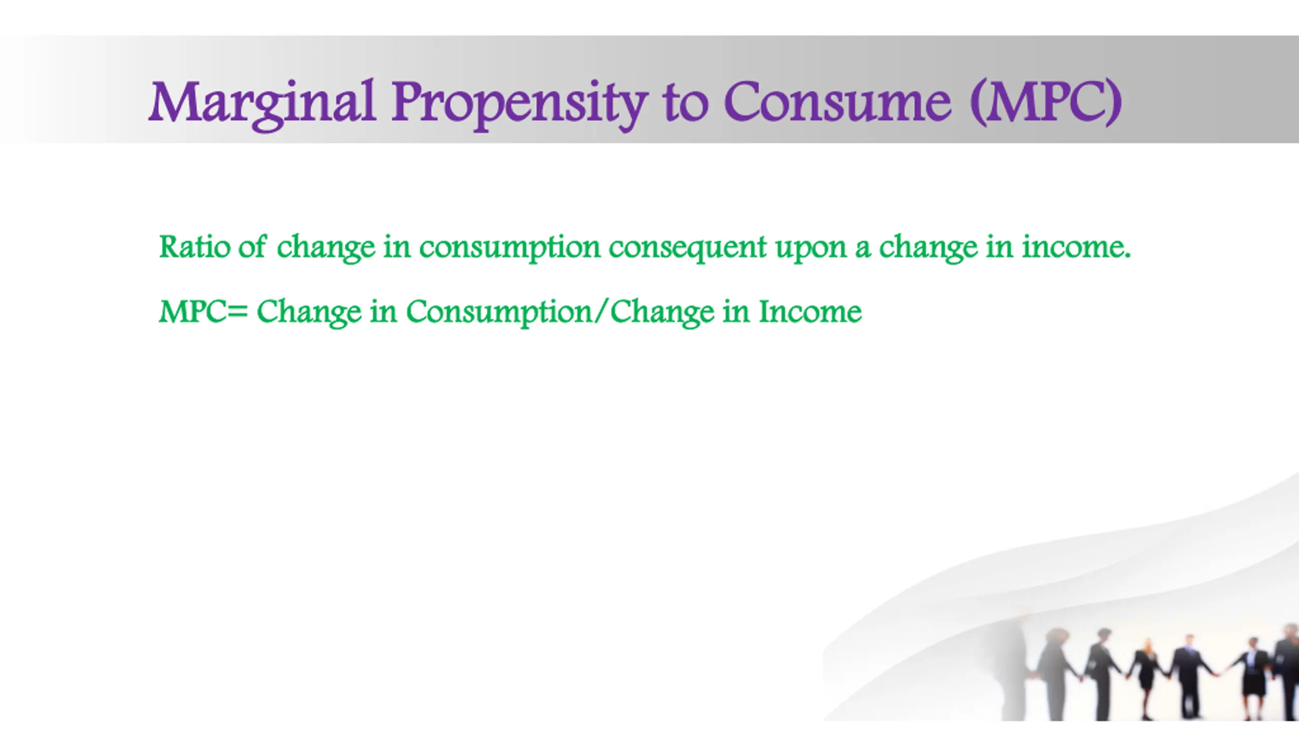 Marginal Propensity to Consume (MPC) Marginal Propensity to Consume (MPC) Ratio of change in consumption consequent upon a change in income. Ratio of change in consumption consequent upon a change in income. MPC= Change in Consumption/Change in Income MPC= Change in Consumption/Change in Income