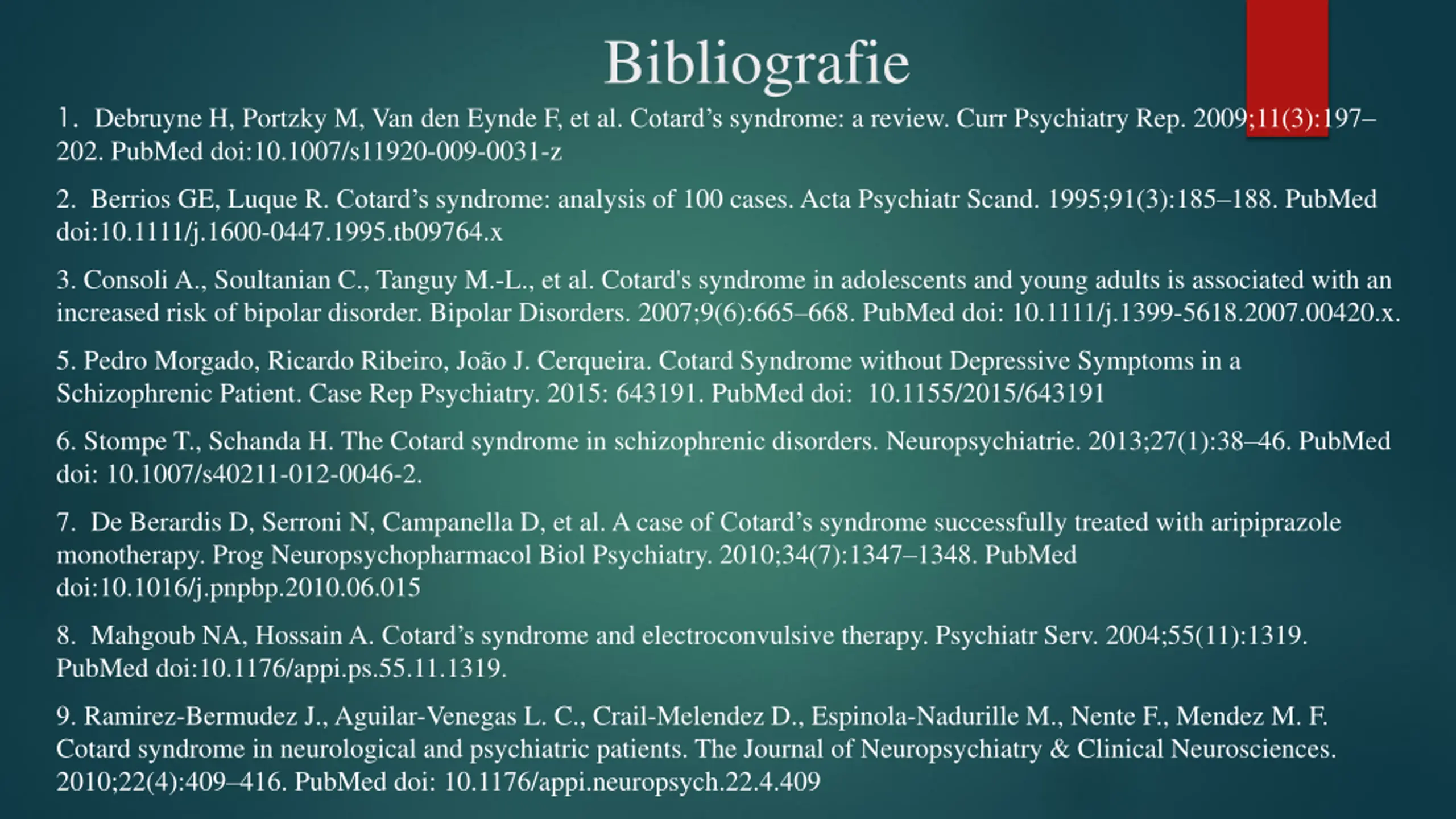 Bibliografie 1. Debruyne H, Portzky M, Van den Eynde F, et al. Cotard s syndrome: a review. Curr Psychiatry Rep. 2009;11(3):197 202. PubMed doi:10.1007/s11920-009-0031-z 2. Berrios GE, Luque R. Cotard s syndrome: analysis of 100 cases. Acta Psychiatr Scand. 1995;91(3):185 188. PubMed doi:10.1111/j.1600-0447.1995.tb09764.x 3. ConsoliA., Soultanian C., Tanguy M.-L., et al. Cotard's syndrome in adolescents and young adults is associated with an increased risk of bipolar disorder. Bipolar Disorders. 2007;9(6):665 668. PubMed doi: 10.1111/j.1399-5618.2007.00420.x. 5. Pedro Morgado, Ricardo Ribeiro, Jo o J. Cerqueira. Cotard Syndrome without Depressive Symptoms in a Schizophrenic Patient. Case Rep Psychiatry. 2015: 643191. PubMed doi: 10.1155/2015/643191 6. Stompe T., Schanda H. The Cotard syndrome in schizophrenic disorders. Neuropsychiatrie. 2013;27(1):38 46. PubMed doi: 10.1007/s40211-012-0046-2. 7. De Berardis D, Serroni N, Campanella D, et al. A case of Cotard s syndrome successfully treated with aripiprazole monotherapy. Prog Neuropsychopharmacol Biol Psychiatry. 2010;34(7):1347 1348. PubMed doi:10.1016/j.pnpbp.2010.06.015 8. Mahgoub NA, HossainA. Cotard s syndrome and electroconvulsive therapy. Psychiatr Serv. 2004;55(11):1319. PubMed doi:10.1176/appi.ps.55.11.1319. 9. Ramirez-Bermudez J., Aguilar-Venegas L. C., Crail-Melendez D., Espinola-Nadurille M., Nente F., Mendez M. F. Cotard syndrome in neurological and psychiatric patients. The Journal of Neuropsychiatry & Clinical Neurosciences. 2010;22(4):409 416. PubMed doi: 10.1176/appi.neuropsych.22.4.409