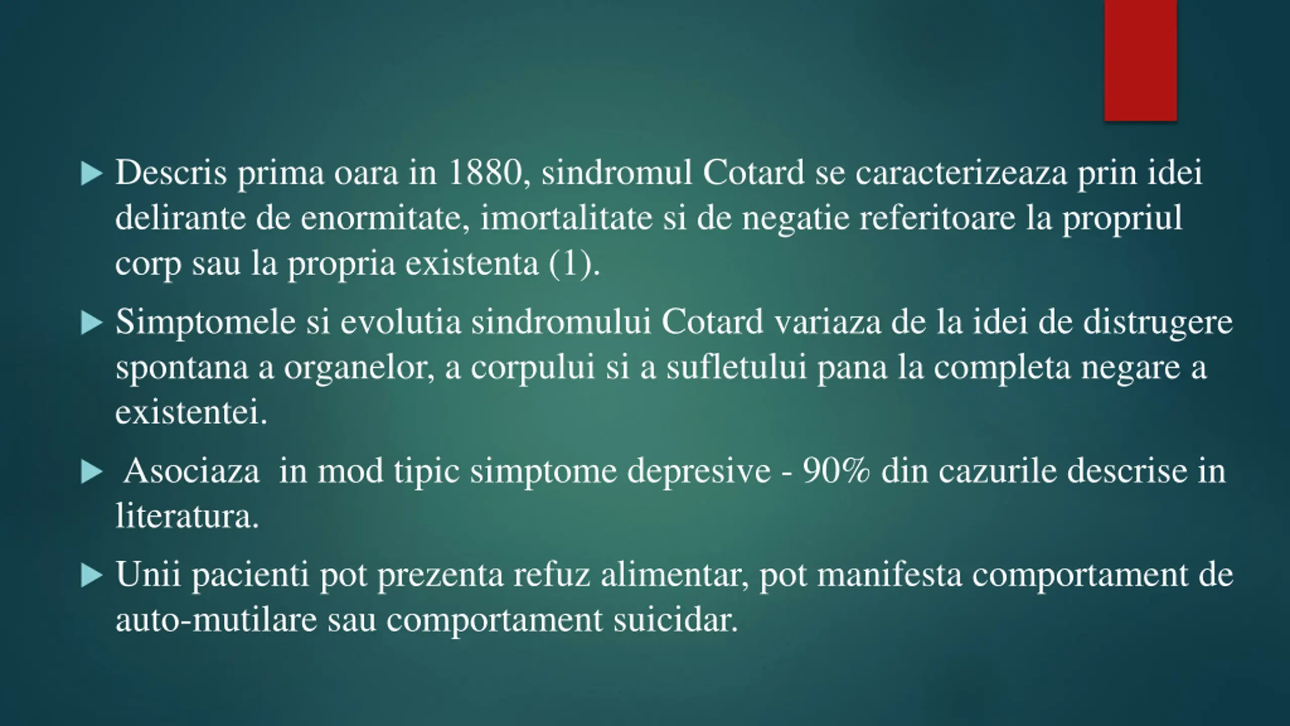 Descris prima oara in 1880, sindromul Cotard se caracterizeaza prin idei delirante de enormitate, imortalitate si de negatie referitoare la propriul corp sau la propria existenta (1). Simptomele si evolutia sindromului Cotard variaza de la idei de distrugere spontana a organelor, a corpului si a sufletului pana la completa negare a existentei. Asociaza in mod tipic simptome depresive - 90% din cazurile descrise in literatura. Unii pacienti pot prezenta refuz alimentar, pot manifesta comportament de auto-mutilare sau comportament suicidar.