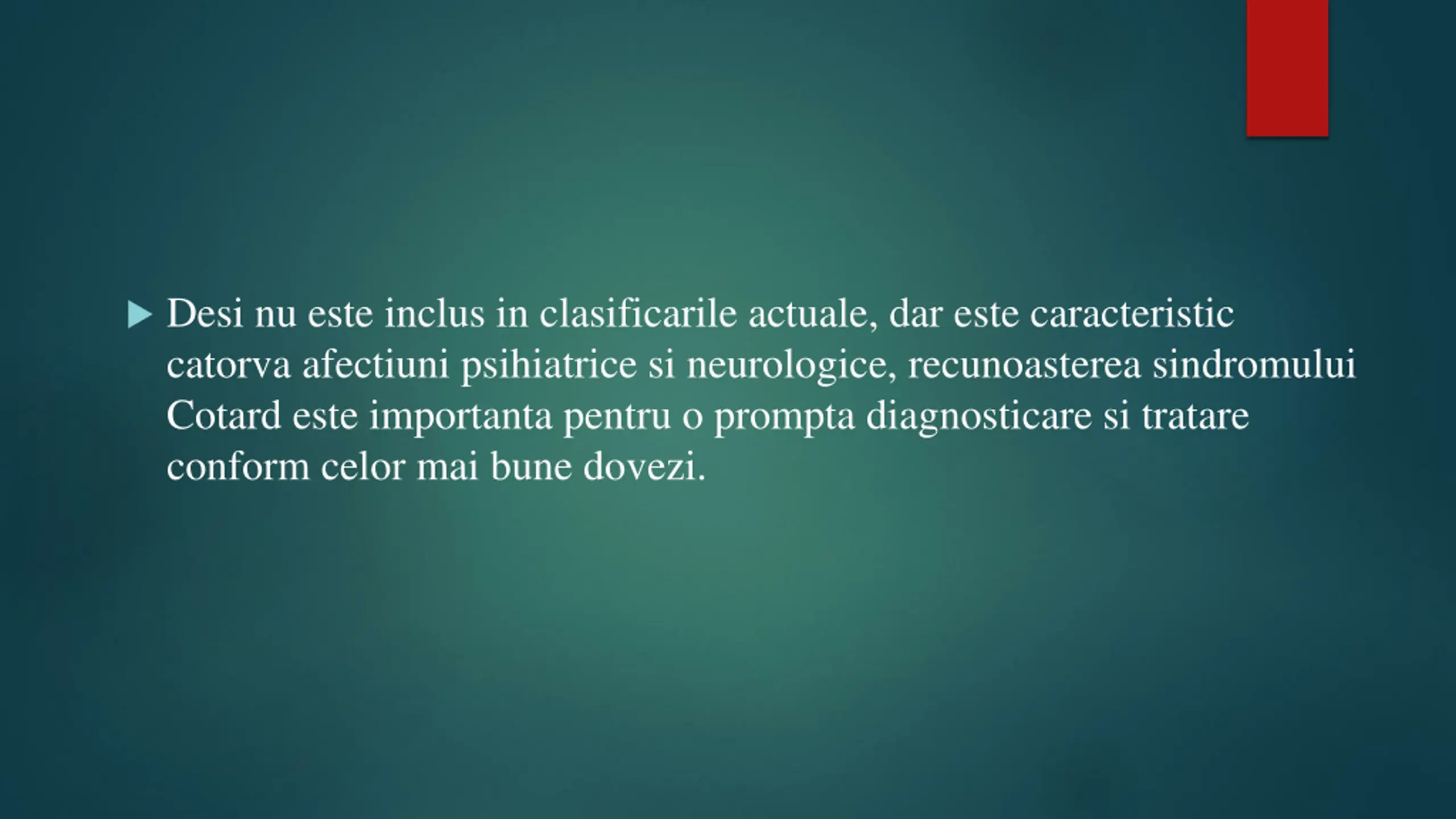 Desi nu este inclus in clasificarile actuale, dar este caracteristic catorva afectiuni psihiatrice si neurologice, recunoasterea sindromului Cotard este importanta pentru o prompta diagnosticare si tratare conform celor mai bune dovezi.