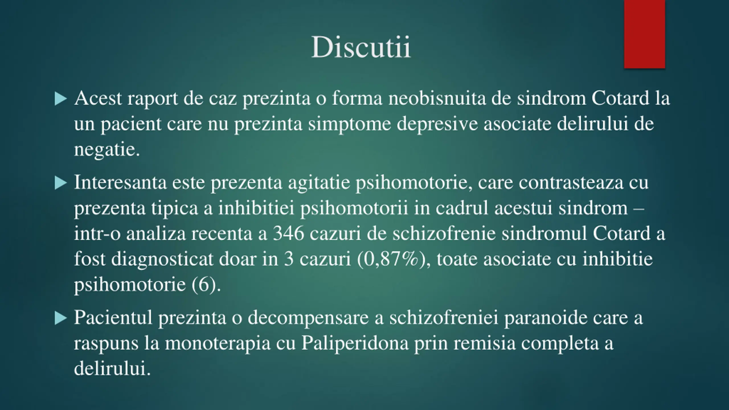 Discutii Acest raport de caz prezinta o forma neobisnuita de sindrom Cotard la un pacient care nu prezinta simptome depresive asociate delirului de negatie. Interesanta este prezenta agitatie psihomotorie, care contrasteaza cu prezenta tipica a inhibitiei psihomotorii in cadrul acestui sindrom intr-o analiza recenta a 346 cazuri de schizofrenie sindromul Cotard a fost diagnosticat doar in 3 cazuri (0,87%), toate asociate cu inhibitie psihomotorie (6). Pacientul prezinta o decompensare a schizofreniei paranoide care a raspuns la monoterapia cu Paliperidona prin remisia completa a delirului.