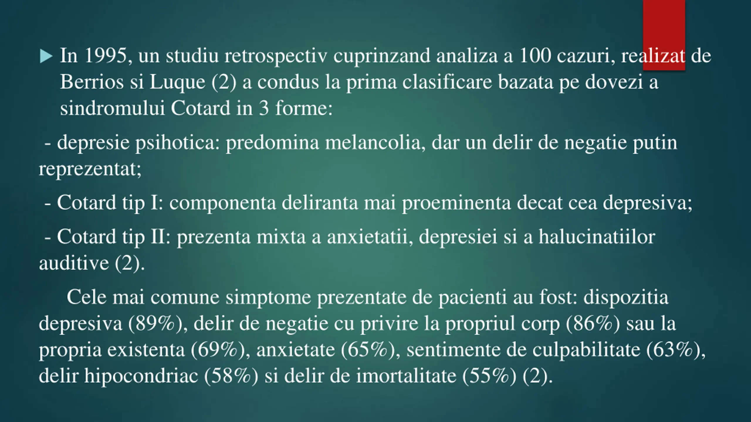 In 1995, un studiu retrospectiv cuprinzand analiza a 100 cazuri, realizat de Berrios si Luque (2) a condus la prima clasificare bazata pe dovezi a sindromului Cotard in 3 forme: - depresie psihotica: predomina melancolia, dar un delir de negatie putin reprezentat; - Cotard tip I: componenta deliranta mai proeminenta decat cea depresiva; - Cotard tip II: prezenta mixta a anxietatii, depresiei si a halucinatiilor auditive (2). Cele mai comune simptome prezentate de pacienti au fost: dispozitia depresiva (89%), delir de negatie cu privire la propriul corp (86%) sau la propria existenta (69%), anxietate (65%), sentimente de culpabilitate (63%), delir hipocondriac (58%) si delir de imortalitate (55%) (2).