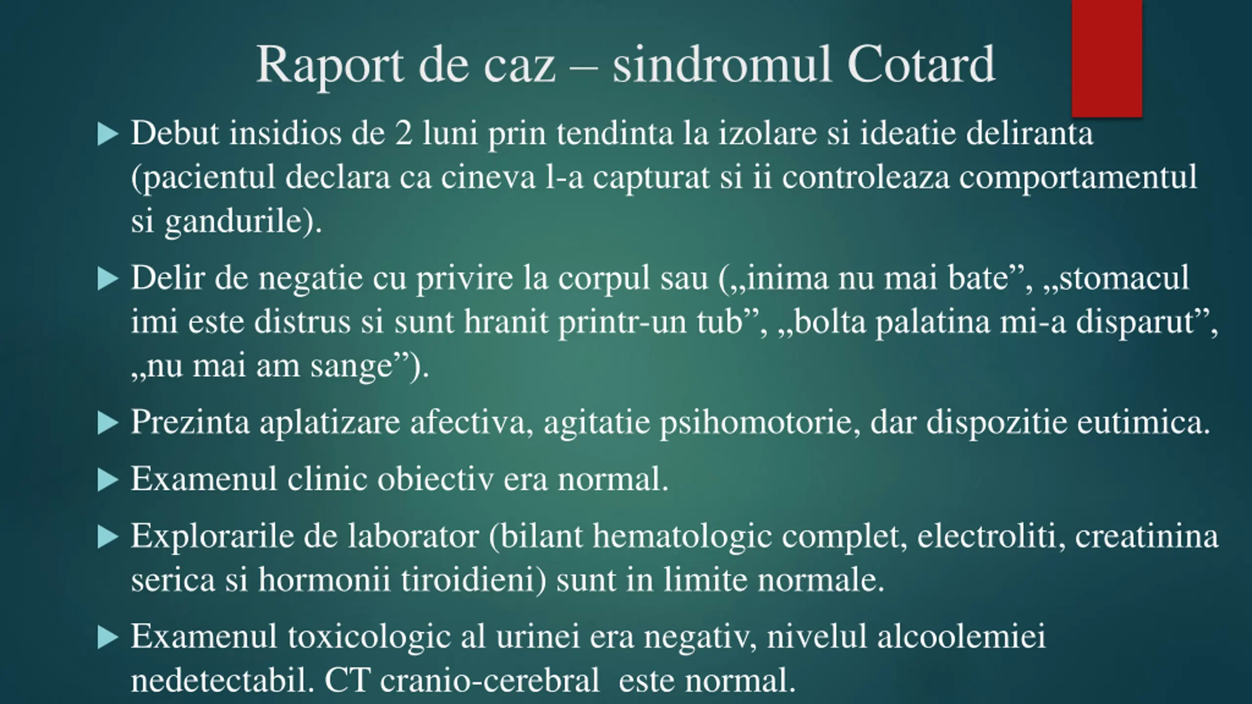 Raport de caz sindromul Cotard Debut insidios de 2 luni prin tendinta la izolare si ideatie deliranta (pacientul declara ca cineva l-a capturat si ii controleaza comportamentul si gandurile). Delir de negatie cu privire la corpul sau ( inima nu mai bate , stomacul imi este distrus si sunt hranit printr-un tub , bolta palatina mi-a disparut , nu mai am sange ). Prezinta aplatizare afectiva, agitatie psihomotorie, dar dispozitie eutimica. Examenul clinic obiectiv era normal. Explorarile de laborator (bilant hematologic complet, electroliti, creatinina serica si hormonii tiroidieni) sunt in limite normale. Examenul toxicologic al urinei era negativ, nivelul alcoolemiei nedetectabil. CT cranio-cerebral este normal.