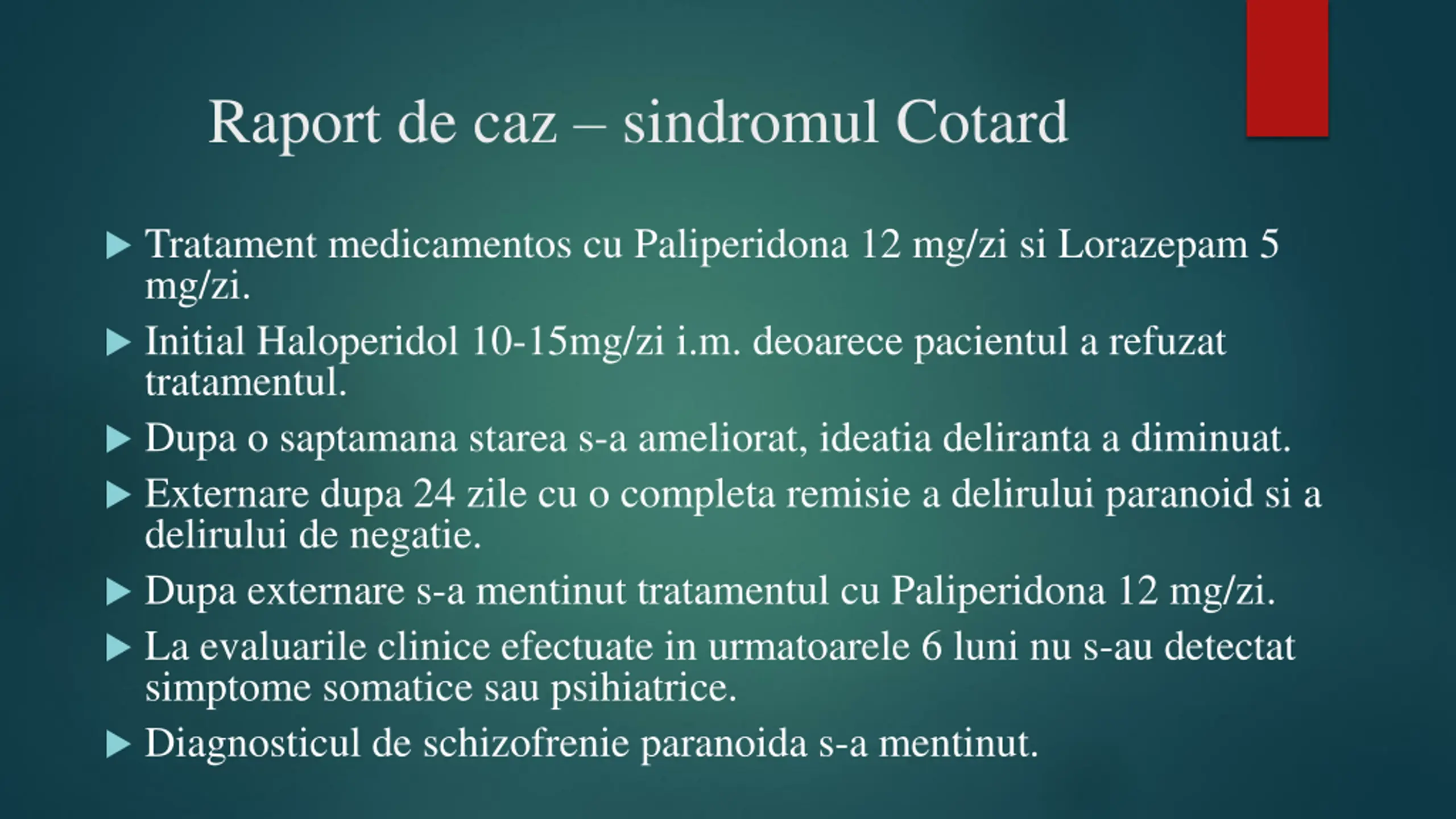 Raport de caz sindromul Cotard Tratament medicamentos cu Paliperidona 12 mg/zi si Lorazepam 5 mg/zi. Initial Haloperidol 10-15mg/zi i.m. deoarece pacientul a refuzat tratamentul. Dupa o saptamana starea s-a ameliorat, ideatia deliranta a diminuat. Externare dupa 24 zile cu o completa remisie a delirului paranoid si a delirului de negatie. Dupa externare s-a mentinut tratamentul cu Paliperidona 12 mg/zi. La evaluarile clinice efectuate in urmatoarele 6 luni nu s-au detectat simptome somatice sau psihiatrice. Diagnosticul de schizofrenie paranoida s-a mentinut.