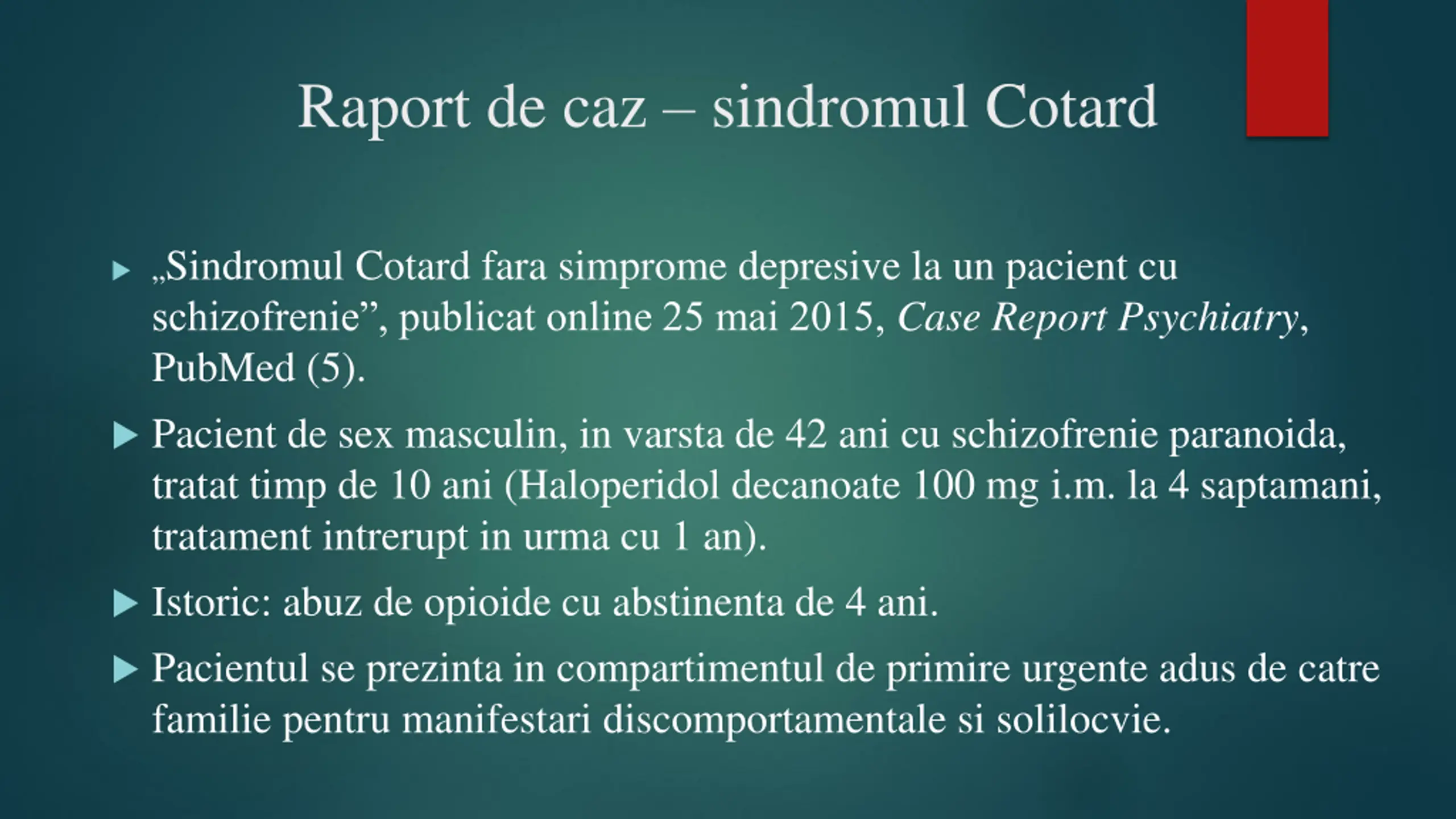 Raport de caz sindromul Cotard Sindromul Cotard fara simprome depresive la un pacient cu schizofrenie , publicat online 25 mai 2015, Case Report Psychiatry, PubMed (5). Pacient de sex masculin, in varsta de 42 ani cu schizofrenie paranoida, tratat timp de 10 ani (Haloperidol decanoate 100 mg i.m. la 4 saptamani, tratament intrerupt in urma cu 1 an). Istoric: abuz de opioide cu abstinenta de 4 ani. Pacientul se prezinta in compartimentul de primire urgente adus de catre familie pentru manifestari discomportamentale si solilocvie.