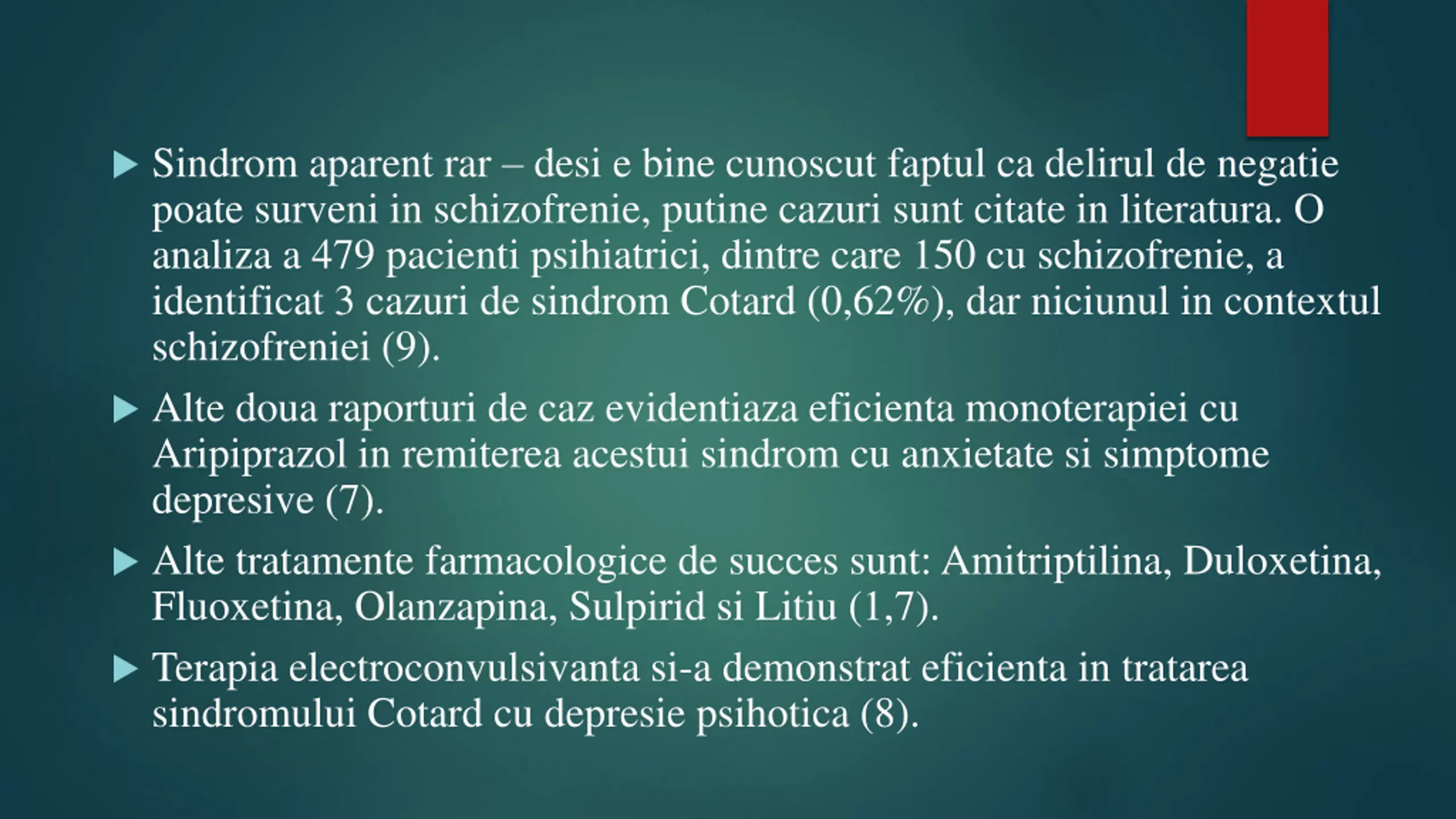 Sindrom aparent rar desi e bine cunoscut faptul ca delirul de negatie poate surveni in schizofrenie, putine cazuri sunt citate in literatura. O analiza a 479 pacienti psihiatrici, dintre care 150 cu schizofrenie, a identificat 3 cazuri de sindrom Cotard (0,62%), dar niciunul in contextul schizofreniei (9). Alte doua raporturi de caz evidentiaza eficienta monoterapiei cu Aripiprazol in remiterea acestui sindrom cu anxietate si simptome depresive (7). Alte tratamente farmacologice de succes sunt: Amitriptilina, Duloxetina, Fluoxetina, Olanzapina, Sulpirid si Litiu (1,7). Terapia electroconvulsivanta si-a demonstrat eficienta in tratarea sindromului Cotard cu depresie psihotica (8).